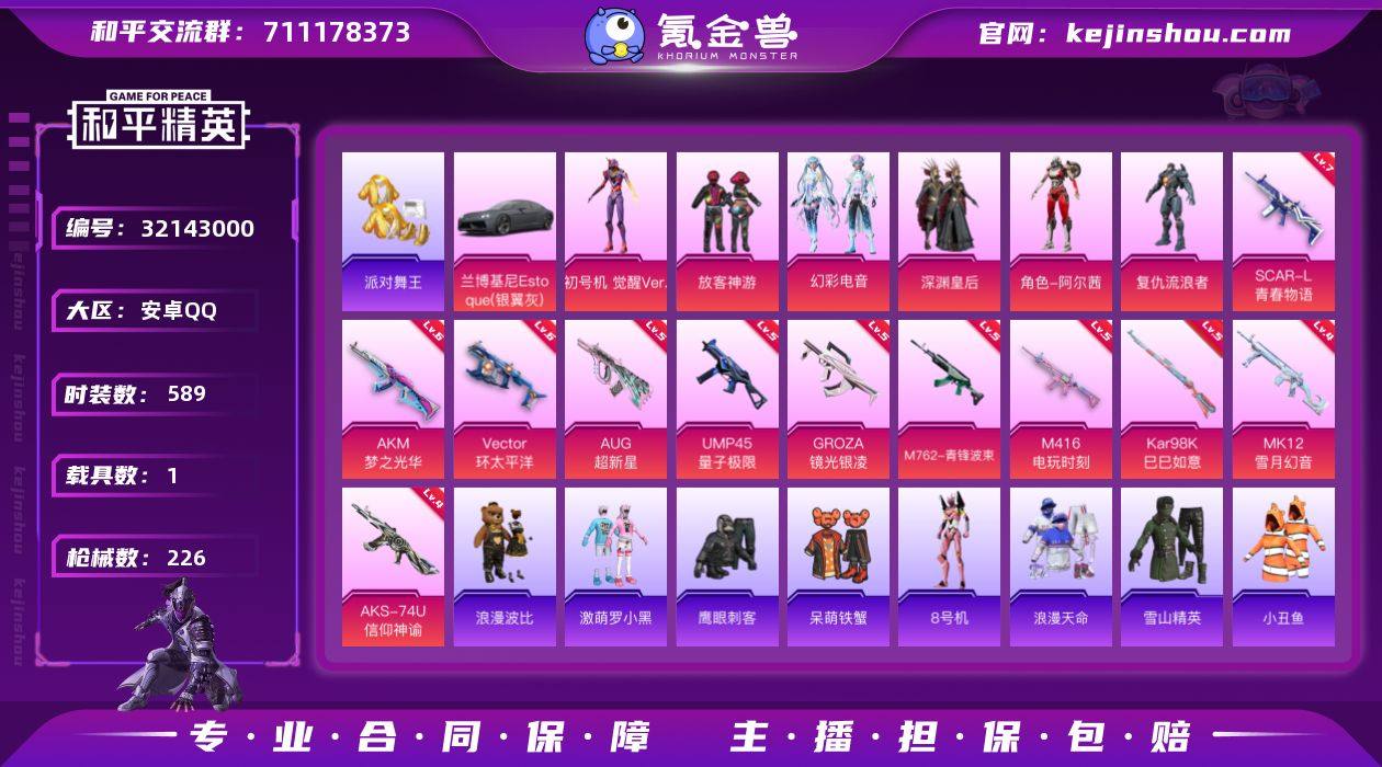 【特价出售】安卓Q-4稀有1载具6粉装13特效枪14热门160套装226枪皮 73807热力值 16印记 历史绝世王牌17星 【4稀有】 AKM-缤纷海域 浪漫天命 派对舞王 派对舞王(金靴子) 【1载具】 兰博轿车灰色 【6粉装】 觉醒初号机 阿尔茜 深渊皇后 幻彩电音 放客神游 复仇流浪者 【13特效枪】 M416-电玩时刻 (5级) AKS-74U-信仰神谕 (4级) Kar98K-巳巳如意 (5级) M762-青锋波束 (5级) AUG-超新星 (5级) M24-虎痴许褚 (6级) UMP45-量子极限 (5级) MK12-雪月幻音 (4级) GROZA-镜光银凌 (5级) AKM-梦之光华 (6级) Mk14-福马献瑞 (5级) Vector-环太平洋 (6级) SCAR-L-青春物语 (7级) 【14热门】 8号机 Mark.06 小丑鱼 龟仙人 雪山精英 呆萌铁蟹 鹰眼刺客 激萌罗小黑 浪漫波比 纯白誓言 粉红小猪 狂沙舞者 军刀雅典娜 英勇保护者 【2飞行器】 深渊漩涡飞行器 青春物语飞行器 【1背包】 百万伏特背包