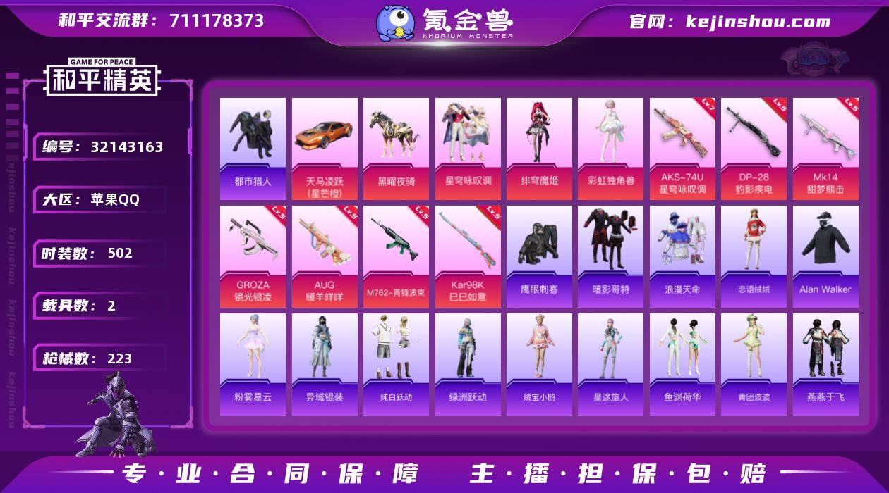 【特价出售】苹果Q-2稀有2载具3粉装10特效枪7热门128套装223枪皮 61105热力值 11印记 历史超级王牌14星 【2稀有】 都市猎人 浪漫天命 【2载具】 天马凌跃(星芒橙) 黑曜夜骑 【3粉装】 绯穹魔姬 彩虹独角兽 星穹咏叹调 【10特效枪】 M416-灵猫魔法师 (3级) AKS-74U-星穹咏叹调 (7级) Kar98K-巳巳如意 (5级) M762-青锋波束 (5级) DP-28-豹影疾电 (5级) AUG-暖羊咩咩 (5级) Mk14-甜梦熊击 (5级) GROZA-镜光银凌 (5级) 汤姆逊-热量炸弹 (5级) Mk14-福马献瑞 (5级) 【7热门】 龟仙人 浪漫假日 鹰眼刺客 暗影哥特 漫步者 极速红龙 弄潮海豚 【1飞行器】 齐天大圣飞行器