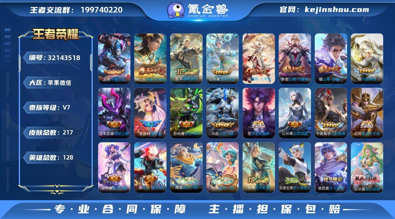AL690525 【清仓无套路:基础限定+热门皮,视频验号放心拍】 皮肤数217 传说皮肤数18 史诗皮肤数72 英雄数128 营地id1824938045 贵族等级【文本】贵族7级 【贵族7级】 荣耀典藏1 内测皮肤2 年限皮肤5 限定皮肤67 赛季限定12 史诗皮肤72 战令限定24 勇者皮肤93 其他皮肤32 荣耀典藏:吕布千魇归渊; 内测皮肤:嬴政优雅恋人,孙尚香蔷薇恋人; 年限皮肤:澜愿照九州拓,黄忠烈魂,李信山海炽霜斩,马可波罗山海玄木吟,曜山海苍雷引; 限定皮肤:狄仁杰神骥赴朔漠,百里玄策罗小黑战记,沈梦溪龙舞盛年,曹操逐霄之志,嬴政优雅恋人,女娲万灵启世,公孙离涂山容容,鬼谷子克喵,后羿石田雨龙,狂铁龙之律动,阿轲化蝶舞,澜愿照九州拓,夏洛特浮生妄,马超访茗客,孙膑茶境仙,太乙真人谧流熔炉,甄姬游园惊梦,东皇太一噬灭天穹,李白谪仙醉月,梦奇顽趣,亚连破空之剑,孙悟空神迹守卫,上官婉儿神器万象笔,奕星炽弈燎原,盘古敬我三分,蔡文姬夏日便利店,孙尚香蔷薇恋人,虞姬夏日便利店,铠冥王哈迪斯,姜子牙天穹之誓,镜青焰无极,项羽苍威无极,刘邦剑破天穹,鲁班七号蔬乡物语,李元芳蔬乡物语,妲己灵卜魔法,高渐离燃音魔法,伽罗琥珀纪元,嫦娥漠中幻影,鬼谷子天穹祈灯,蒙恬荣光圣徽,狄仁杰鹰眼统帅,蒙犽百解令,艾琳流音漫舞,司空震地狱燃心,阿古朵江河有灵,张良古海寻踪,鲁班七号乒乒小将,戈娅驭风魔法,马可波罗妄想实况,西施玲珑珍味,鲁班大师探海日志,扁鹊奇幻香踪,杨戬潮玩骑兵,关羽百相守梦,裴擒虎擒涛扼浪,狄仁杰阴阳师,暃星界游侠,嫦娥暖冬兔眠,狄仁杰魔术师,黄忠烈魂,赵云皇家上将,李信山海炽霜斩,项羽海滩派对,马可波罗山海玄木吟,曜山海苍雷引,桑启海盐诗旅; 赛季限定:亚瑟荣光之誓,太乙真人谧流熔炉,东皇太一噬灭天穹,梦奇顽趣,姜子牙天穹之誓,刘邦剑...