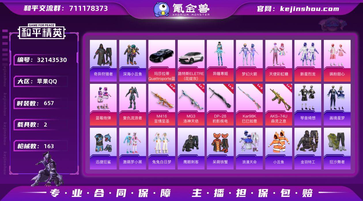 【特价出售】苹果Q-2稀有2载具7粉装8特效枪21热门167套装163枪皮 60537热力值 16印记 历史超级王牌9星 【2稀有】 奇异狩猎者 浪漫天命 【2载具】 路特斯EL灰色 玛莎拉蒂Q蓝色 【7粉装】 梦幻火箭 天使彩虹糖 异瞳寒姬 飒粉甜心 新星烈龙 复仇流浪者 蓝莓炮弹 【8特效枪】 AKS-74U-森灵之息 (4级) Kar98K-巳巳如意 (5级) DP-28-豹影疾电 (5级) M416-至情至圣 (9级) MG3-洛神天依 (7级) AKS-74U-森灵之息 (4级) Mk14-福马献瑞 (5级) UMP45-萌骑冒险 (2级) 【21热门】 小丑鱼 龟仙人 呆萌铁蟹 鹰眼刺客 兔兔白日梦 激萌罗小黑 迅捷狂鲨 深海小丑鱼 金羽特工 NV战队服 迪迦奥特曼 团圆交子 瑞龙福将 粉红小猪 狂沙舞者 漫步者 破蛋小黄鸡 弄潮海豚 M762-瑞龙福将 M24-奇异狩猎者 M762-风花雪月 【3头盔】 梦幻火箭头盔 甜心宝贝头盔 深海小丑鱼头盔 【2背包】 梦幻火箭背包 深海小丑鱼背包
