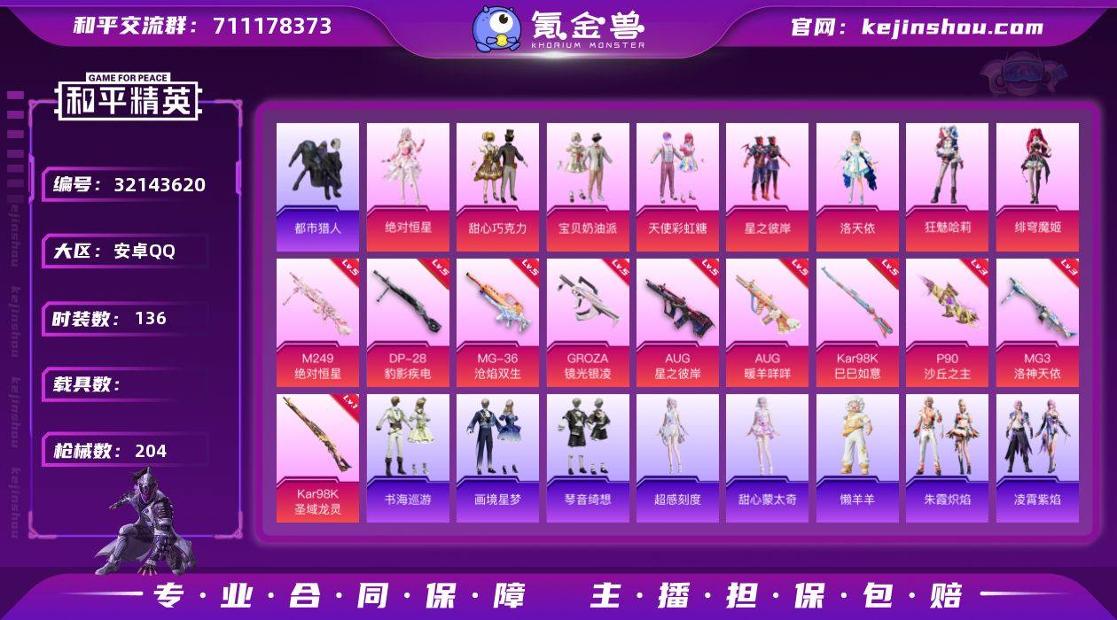 安卓 手Q-9粉装-15特效枪-0载具-8粉色飞行器-59417热力值-3王牌印记-136套装-204枪皮 【热门品类】:套装-浪漫天命,套装-都市猎人,套装-龟仙人,套装-暗影哥特 【粉色套装】:角色-绝对恒星,粉装-甜心巧克力,粉装-宝贝奶油派,粉装-天使彩虹糖,粉装-星之彼岸,角色-洛天依,角色-狂魅哈莉,角色-绯穹魔姬,人物-小舞·灵珑 【粉色枪皮等级】:GROZA-镜光银凌(五级),AUG-星之彼岸(五级),AUG-暖羊咩咩(五级),UMP45-萌骑冒险(一级),AKS-74U-森灵之息(五级),P90-沙丘之主(三级),Kar98K-巳巳如意(五级),Kar98K-圣域龙灵(一级),Mk14-福马献瑞(五级),M249-绝对恒星(五级),DP-28-豹影疾电(五级),MG3-洛神天依(三级),MG-36-沧焰双生(五级),燃烧瓶-天降桃花(三级),破片手榴弹-招财进宝(四级) 【粉色枪皮】:GROZA-镜光银凌,AUG-星之彼岸,AUG-暖羊咩咩,UMP45-萌骑冒险,AKS-74U-森灵之息,P90-沙丘之主,Kar98K-巳巳如意,Kar98K-圣域龙灵,Mk14-福马献瑞,M249-绝对恒星,DP-28-豹影疾电,MG3-洛神天依,MG-36-沧焰双生,燃烧瓶-天降桃花,破片手榴弹-招财进宝 【粉色飞行器】:绝对恒星飞行器,香车宝马飞行器,炫彩糖果飞行器,沙丘之主天马,幻海精灵飞行器,曦光华影飞行器,灵猫魔法师飞行器 【粉色降落伞】:绝对恒星降落伞,幻影战神降落伞,甜心宝贝降落伞,星之彼岸降落伞,洛神天依降落伞,沙丘之主降落伞,忍者神龟降落伞,BEARBRICK降落伞,幻海仙踪降落伞,魔童闹海 哪吒降落伞,异瞳寒姬降落伞,炫彩糖果降落伞,小舞降落伞 【稀有套装】:套装-龟仙人,套装-巳巳如意,角色-超感刻度,角色-甜心蒙太奇,套装-雪国风尚,套装-炫彩糖果,套装-马上有钱,套装-雏菊兔兔,套装-萝兰蝴蝶,角色-狂花道·娜可露露,套装-糖糖葫芦,套装-青团波波,套装-燕燕于飞,套装-鱼渊荷华,套装-新风雅兰...