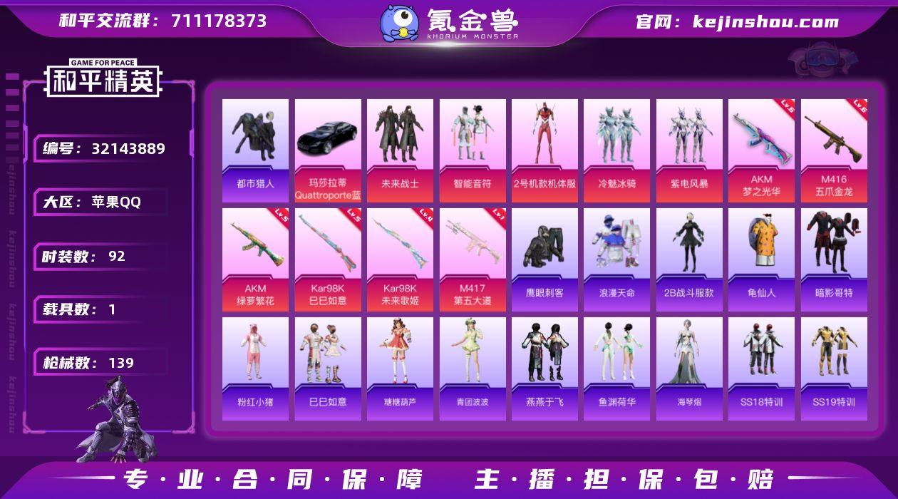 不可二次 苹果 手Q-5粉装-6特效枪-1载具-1粉色飞行器-40557热力值-11王牌印记-92套装-139枪皮 QW263607 【热门品类】:套装-浪漫天命,套装-都市猎人,角色-2B战斗服款,套装-龟仙人,套装-暗影哥特,套装-粉红小猪 【粉色套装】:粉装-未来战士,粉装-智能音符,角色-2号机款机体服,粉装-冷魅冰骑,粉装-紫电风暴 【粉色枪皮等级】:AKM-梦之光华(六级),AKM-绿萝繁花(五级),M416-五爪金龙(六级),Kar98K-未来歌姬(四级),Kar98K-巳巳如意(五级),M417-第五大道(一级) 【粉色载具】:玛莎拉蒂Quattroporte(夜幕蓝) 【粉色枪皮】:AKM-梦之光华,AKM-绿萝繁花,M416-五爪金龙,Kar98K-未来歌姬,Kar98K-巳巳如意,M417-第五大道 【粉色飞行器】:霓虹漫游飞行器 【粉色降落伞】:冷魅冰骑降落伞,第五大道降落伞,仲夏莫吉托降落伞,幻影飞狐降落伞 【稀有套装】:套装-龟仙人,套装-巳巳如意,套装-糖糖葫芦,套装-青团波波,套装-燕燕于飞,套装-鱼渊荷华,角色-海琴烟 【稀有枪皮】:AKM-奇异狩猎者,AKM-彩虹符号,AKM-影袭,AKM-霓虹街区,AKM-龙的传人,M16A4-幻世战舞者,SCAR-L-炫彩节奏,SCAR-L-红色方程式,SCAR-L-黄金龙骨,M416-动感兔斯基,M416-糯团青竹,GROZA-2B战斗服款,GROZA-异彩先驱,GROZA-影袭,GROZA-懵萌河马,GROZA-田园牧歌,GROZA-蓝莓炮弹,AUG-天降萌叽,AUG-甜蜜菠萝,QBZ-未来歌姬,M762-天降萌叽,M762-奇异狩猎者,M762-彩虹符号,Mk47-妙红点点,G36C-冷魅冰骑,G36C-懵萌河马,蜜獾-天降萌叽,UZI-天降萌叽,UZI-幻影战神,UZI-影袭,UMP45-涂山之恋,UMP45-炫光之旅,UMP45-生命誓言,UMP45-蓝色火焰,UMP45-金玉无双,Vector-田园牧歌,Vector-金玉无双,汤姆逊-天降萌叽,汤姆逊-异彩先驱,汤姆逊-炫彩节奏,MP5K-异彩先驱,MP5K-蓝莓炮弹,AKS-74U-鬼刀,P90-巳巳如...