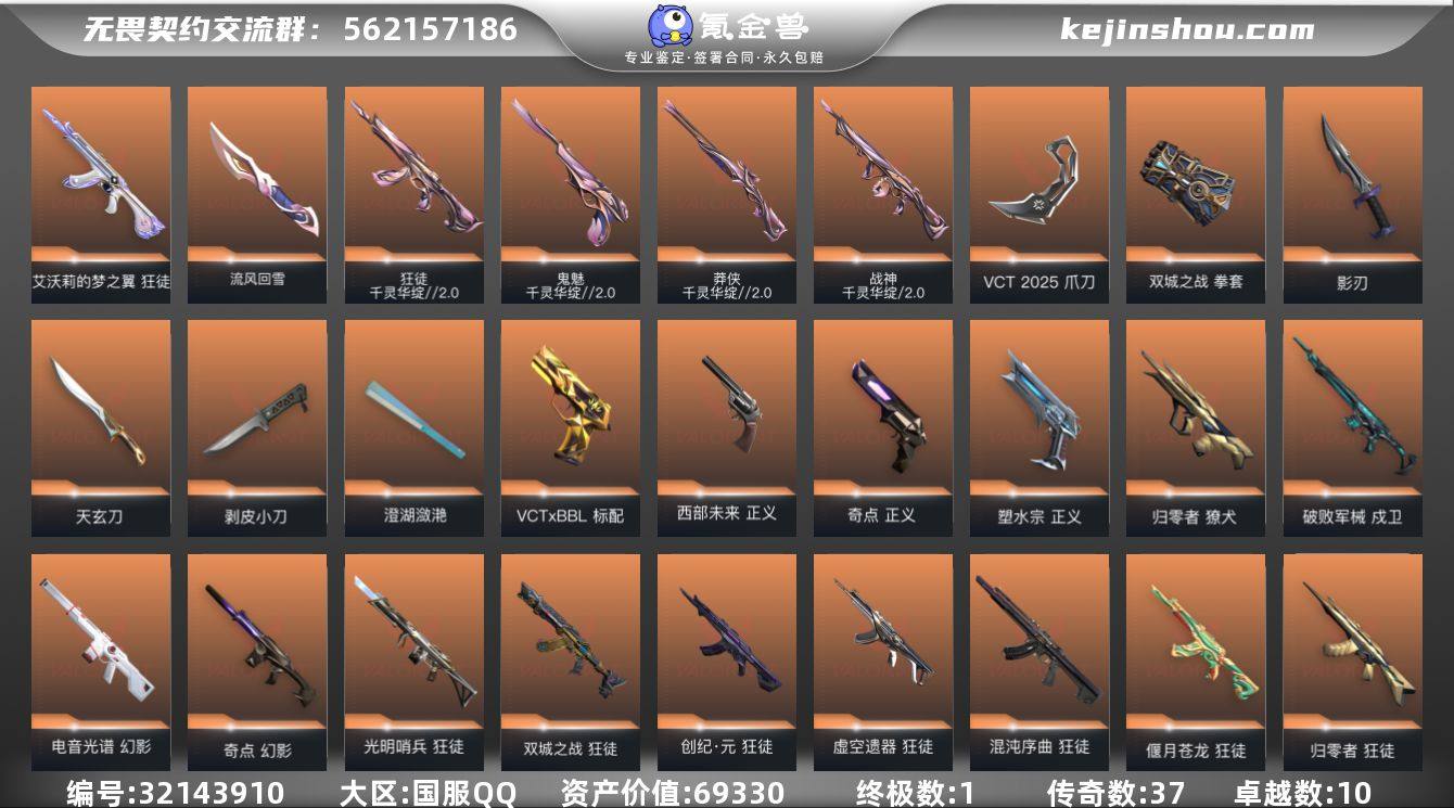 【自带包赔 可赔三倍】:库存价值 69330 17主战 8近战 超精品性价比库存号 入手无忧 可包人脸 【限定】: VCT 2025 爪刀, 双城之战 狂徒, 双城之战 拳套 【近战】: 流风回雪, VCT 2025 爪刀, 天玄刀, 双城之战 拳套, 影刃, 魄月玄刃, 剥皮小刀, 澄湖潋滟 【狂徒】: 艾沃莉的梦之翼 狂徒, 千灵华绽//2.0 狂徒, 光明哨兵 狂徒, 虚空遗器 狂徒, 创·纪元 狂徒, 盖亚的复仇 狂徒, 双城之战 狂徒, 掠影 狂徒, 堕天遗武 狂徒, 混沌序曲 狂徒, 全息波普//2.0 狂徒, 归零者 狂徒, 紫阙金琅 狂徒, 塑水宗 狂徒, 偃月苍龙 狂徒 【幻影】: 电音光谱 幻影, 奇点 幻影 【冥驹】: 掠影 冥驹, 堕天遗武 冥驹 【正义】: 西部未来 正义, 掠影 正义, 奇点 正义, 塑水宗 正义 【戍卫】: 掠影 戍卫, 破败军械 戍卫 【獠犬】: 归零者 獠犬 【鬼魅】: 盖亚的复仇 鬼魅, 千灵华绽//2.0 鬼魅, 侦察力量 鬼魅 【标配】: VCT x BBL 标配 【战神】: 千灵华绽//2.0 战神 【莽侠】: 千灵华绽//2.0 莽侠 【概要】: 总皮肤154 终极1 传奇37 卓越10 刀皮8 英雄28 LV338 历史最高:超凡 当前段位:铂金 已使用 1865 R点 剩余100 R点 不可二次 卡面、挂饰、其他皮肤请看截图 道具、段位等以实际验号为准。如账号因没有维护,赛季更新等不可抗因素发生变化,不属于账号质量问题"