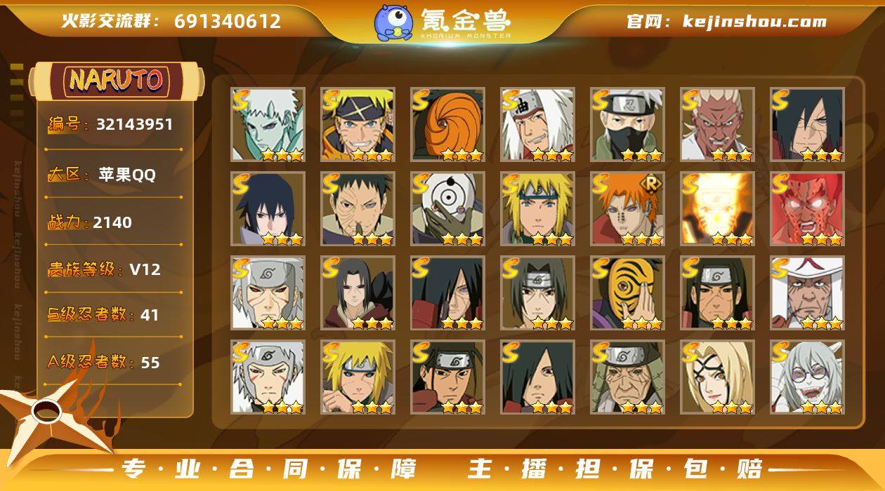 YY-41S/55A/V12/战力2140/忍者299/有二次/果Q396/可转系统 【霸体13级 时空间6级 金币3.8k 仙自49 金身水门80 创立斑80 秽土半藏88 舍人80 yy】 S:纲手,大蛇丸,日斩,须佐鼬,十周年鸣佐,九喇嘛,永恒佐助,忍战樱,须佐卡卡西,自来也,豪杰自来也,传说自来也,百豪纲手,死门凯,水门,秽土水门,秽土日斩,秽土扉间,扉间,柱间,秽土柱间,斑,秽土斑,秽土解斑,秽土鼬,神秘面具男,白面具,五影斑,忍战带土,十尾带土,鬼灯幻月,忍战艾,三代艾,金角银角,忍战大野木,无,天道佩恩,天道超,秽土长门,仙人兜,金式 A:蛇兜 面麻 仙鸣 机械鸣人 金鸣 鹰佐 骨架 侠隐佐助 泉奈 百豪樱 忍战宁次 忍战小李 最终章雏田 神卡 止水 青水 忍战我爱罗 秽土再不斩 青年艾 忍战土台 青年长门 漂泊佩恩 小南 神驹小南 秽土角都 晓蛇 绯流琥蝎 死迪 恶灵飞段 侠隐大野木 神农 雷影达鲁伊 桃博 普通人 仙人巳月 黑土 通灵:蜘蛛 守鹤 蛞蝓 鹰 梦貘 蛤蟆广 蛤蟆龙 战力/组织以实际验号为准,如账号没有维护/赛季更新等不可抗拒因素发生变化,不属于账号质量问题