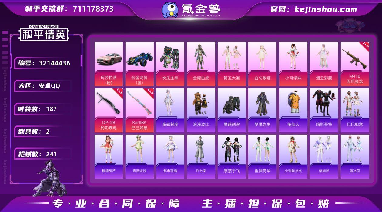 不能二次 安卓 手Q-9粉装-8特效枪-2载具-2粉色飞行器-79010热力值-15王牌印记-187套装-241枪皮 HZ2636011 【热门品类】:套装-龟仙人,套装-暗影哥特,套装-浪漫波比 【粉色套装】:粉装-快乐主宰,粉装-金曜白虎,粉装-第五大道,角色-白勺歌姬,角色-小可学妹,角色-烟云彩露,人物-小舞·灵珑,人物-小舞·雪昙,人物-小舞·恋语 【粉色枪皮等级】:M416-五爪金龙(七级),ACE32-萌骑漫游(五级),UMP45-萌骑冒险(五级),Kar98K-巳巳如意(五级),Mk14-福马献瑞(五级),AA12-G-萌骑幻想(三级),DP-28-豹影疾电(五级),PKM-萌骑夺宝(二级) 【粉色载具】:玛莎拉蒂Ghibli(粉),合金龙骨(蓝) 【粉色枪皮】:M416-五爪金龙,ACE32-萌骑漫游,UMP45-萌骑冒险,Kar98K-巳巳如意,Mk14-福马献瑞,AA12-G-萌骑幻想,DP-28-豹影疾电,PKM-萌骑夺宝 【粉色飞行器】:春暖花开飞行器 【粉色降落伞】:至尊龙雀降落伞,雪国幻梦降落伞,春暖花开降落伞,四圣焕新降落伞,暗夜玫瑰降落伞,第五大道降落伞,飒粉甜心降落伞,白勺歌姬降落伞,镜域双华降落伞,精灵梦叶罗丽降落伞,金丰海韵降落伞,临安公主降落伞,星穹咏叹调降落伞 【稀有套装】:套装-龟仙人,套装-巳巳如意,角色-超感刻度,套装-雪国风尚,套装-彩虹骑师,角色-奈斯,角色-魂电,角色-罗莉,角色-幸运青,角色-X,角色-阿虎,套装-马上有钱,套装-糖糖葫芦,套装-青团波波,角色-都市丽猫,角色-许七安,套装-燕燕于飞,套装-鱼渊荷华,玩偶服-小狗蛇点点,套装-紫幽梦,套装-蓝冰羽,套装-星渊小夜曲,套装-雨过天青,套装-红釉青花,玩偶服-会说话的汤姆猫 【稀有枪皮】:AKM-夜灯,AKM-影袭,AKM-春暖花开,AKM-灼热熔岩,AKM-生命誓言,AKM-破晓战魂,AKM-缤纷海域,AKM-虎虎生威,AKM-霓虹街区,AKM-龙的传人,M16A4-幻世战舞者,M16A4-红色方程式,M1...