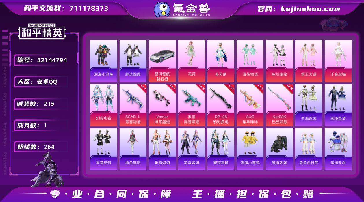 安卓 【公主号 浪漫天命/深海小丑鱼/胖达圆圆/红熊茄茄/洛天依/SCAR-L-青春物语(七级)/AUG-暖羊咩咩(五级)/星河领航(磐石银)】手Q-7粉装-6特效枪-1载具-4粉色飞行器-83622热力值-15王牌印记-215套装-264枪皮 【热门品类】:套装-浪漫天命,套装-深海小丑鱼,套装-胖达圆圆,套装-龟仙人,套装-潮萌小黄鸭,套装-红熊茄茄 【粉色套装】:角色-洛天依,粉装-薄荷物语,粉装-冰川幽秘,粉装-第五大道,角色-千金淑猫,粉装-幻彩电音,角色-花灵 【粉色枪皮等级】:SCAR-L-青春物语(七级),AUG-暖羊咩咩(五级),蜜獾-异瞳寒姬(五级),Vector-绯穹魔姬(七级),Kar98K-巳巳如意(五级),DP-28-豹影疾电(五级) 【粉色载具】:星河领航(磐石银) 【粉色枪皮】:SCAR-L-青春物语,AUG-暖羊咩咩,蜜獾-异瞳寒姬,Vector-绯穹魔姬,Kar98K-巳巳如意,DP-28-豹影疾电 【粉色飞行器】:炫彩糖果飞行器,飞天猪飞行器,灵珠游龙飞行器,极意拳锋飞行器 【粉色降落伞】:绝对恒星降落伞,快乐主宰降落伞,暗星紫秘降落伞,青春物语降落伞,垂柳戏鸭降落伞,青空秋雨降落伞,第五大道降落伞,飒粉甜心降落伞,精灵梦叶罗丽降落伞,千金淑猫降落伞,彩虹独角兽降落伞,樱桃泡泡降落伞,幻彩电音降落伞,喜羊羊与灰太狼降落伞,魔童闹海 敖丙降落伞,异瞳寒姬降落伞,炫彩糖果降落伞 【稀有套装】:套装-龟仙人,套装-绒宝小鹅,套装-巳巳如意,套装-圣穹绘梦,套装-小鸟芋圆,套装-炫彩糖果,套装-糖糖葫芦,套装-青团波波,套装-棉花软糖,角色-都市丽猫,角色-摩登魅猫,角色-临安公主,套装-燕燕于飞,套装-鱼渊荷华,套装-晶辉守护,角色-糖霜甜心,角色-蜜桃派对,角色-青瓷战姬,套装-星影赞美诗,套装-彩虹兔,套装-云朵鹅,套装-雪绒豹,套装-蜜露汐语,角色-绛羽幽主,角色-夜瞳黯灵,套装-朱霞炽焰,套装-凌霄紫焰,套...