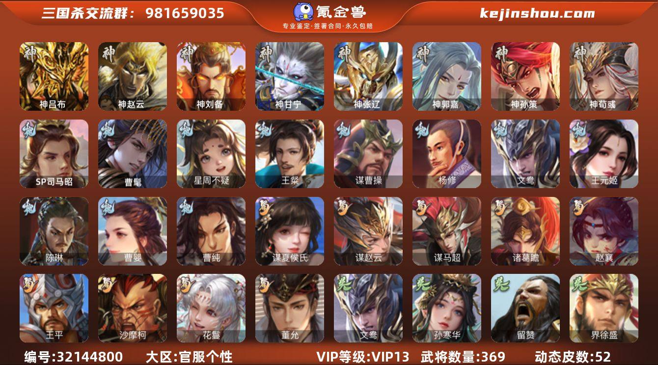 【1053】官阶:大将军;VIP等级:VIP13;史诗武将数量:44;动态皮肤数量:52;武将总数:369;史诗宝珠数量:5;将魂数量:3654;神将:10;魏国史诗武将:20;蜀国史诗武将:9;吴国史诗武将:4;群史诗武将:12 神吕布,神赵云,神刘备,神甘宁,神张辽,神郭嘉,神孙策,神荀彧,神吕蒙,神周瑜,SP司马昭,曹髦,星周不疑,王粲,谋曹操,杨修,文鸯,王元姬,魏-司马昭,陈琳,曹婴,曹纯,谋夏侯氏,谋赵云,谋马超,诸葛瞻,赵襄,王平,沙摩柯,花鬘,董允,孙寒华,留赞,界徐盛,界步练师,谋郭嘉,界沮授,左慈,麹义,南华老仙,祢衡,刘焉,沮授,界左慈,界李儒,阎象,友徐庶,神张辽-威震江东,神郭嘉-虎年清明(动态),神郭嘉-倚星折月(动态),神孙策-霸王再世(动态),神荀彧-虎年清明(动态),神荀彧-匡汉延祚(动态),神刘备-龙兴海内,神甘宁-万人辟易(动态),神关羽-佑子伐吴,神吕布-冠绝天下(动态),郭嘉-以身证道(动态),曹丕-气荡山河(动态),甄姬-明珠耀躯(动态),SP蔡文姬-兔年冬日(动态),邓艾-神兵天降(动态),界邓艾-神兵天降(动态),曹婴-兔年春节(动态),曹婴-锋芒毕露(动态),曹婴-水清灈缨(动态),司马昭-昭威淮南(动态),卧龙诸葛-龙跃凤鸣(动态),夏侯氏-明良千古(动态),关银屏-兔年春节(动态),诸葛果-虎年中秋(动态),孙策-兔年清明(动态),周处-义除三害(动态),周瑜-运筹帷幄(动态),孙权-永开吴祚(动态),周瑜-免年清明(动态),黄盖-鏖战赤壁(动态),界黄盖-鏖战赤壁(动态),徐盛-破军杀将(动态),刘赞-灵魂歌王(动态),文鸯-势若万钧(动态),貂蝉-忧君难寐(动态),貂蝉-舞惑群心(动态),袁绍-声震寰宇(动态),麹义-扬刀立威(动态),何太后-蛇蝎为心(动态),刘焉-雄踞益州(动态)