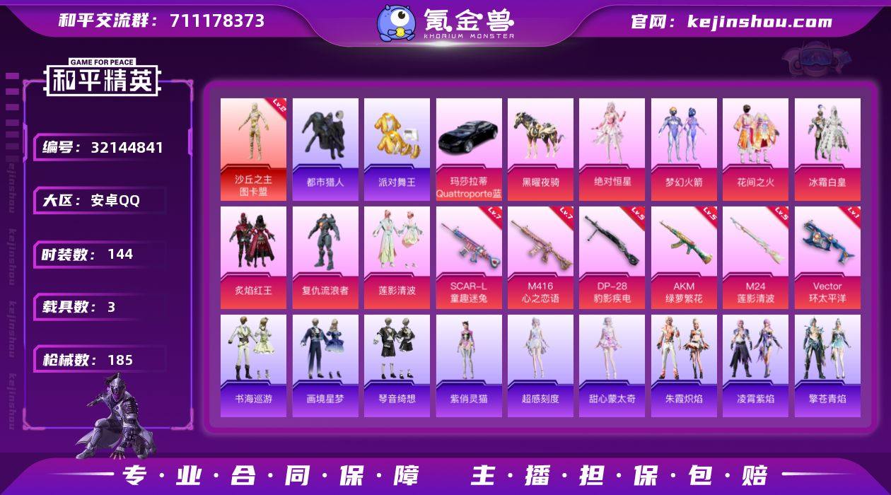 安卓 【神装号 沙丘之主-图卡盟(二级)/梦幻火箭/浪漫天命/都市猎人/派对舞王/暗影哥特/AKM-绿萝繁花(五级)/AKM-暮色玫影(三级)/SCAR-L-童趣迷兔(七级)/M416-心之恋语(七级)/玛莎拉蒂Quattroporte(夜幕蓝)】手Q-1神装-7粉装-8特效枪-3载具-4粉色飞行器-64692热力值-10王牌印记-144套装-185枪皮 【红色神装等级】:沙丘之主-图卡盟(二级) 【红色角色神装】:沙丘之主-图卡盟 【热门品类】:粉装-梦幻火箭,套装-浪漫天命,套装-都市猎人,套装-派对舞王,角色-军刀雅典娜,套装-龟仙人,套装-暗影哥特,熔岩游骑兵连帽夹克 【粉色套装】:角色-绝对恒星,粉装-梦幻火箭,粉装-花间之火,粉装-冰霜白皇,粉装-炙焰红王,角色-复仇流浪者,粉装-莲影清波 【粉色枪皮等级】:AKM-绿萝繁花(五级),AKM-暮色玫影(三级),SCAR-L-童趣迷兔(七级),M416-心之恋语(七级),Vector-环太平洋(一级),M24-莲影清波(五级),Mk14-福马献瑞(一级),DP-28-豹影疾电(五级) 【粉色载具】:玛莎拉蒂Quattroporte(夜幕蓝),黑曜夜骑,暮色幽蹄 【粉色枪皮】:AKM-绿萝繁花,AKM-暮色玫影,SCAR-L-童趣迷兔,M416-心之恋语,Vector-环太平洋,M24-莲影清波,Mk14-福马献瑞,DP-28-豹影疾电 【粉色飞行器】:绝对恒星飞行器,炫彩糖果飞行器,闪光银龙飞行器,暮色之舞飞行器 【粉色降落伞】:绝对恒星降落伞,幻影战神降落伞,梦幻火箭降落伞,碧影闪光降落伞,橘柚倾心降落伞,环太平洋降落伞,歌者泠鸢降落伞,圣堂之誓降落伞,冷漠罗丽降落伞,无垠阁降落伞,喜羊羊与灰太狼降落伞,炫彩糖果降落伞,暮色玫影降落伞 【稀有套装】:套装-龟仙人,角色-超感刻度,角色-甜心蒙太奇,套装-雪国风尚,套装-炫彩糖果,角色-罗莉,套装-云朵鹅,套装-雪绒豹,角色-夜瞳黯灵,套装-朱霞炽焰,套装-凌霄紫焰,套装-擎苍青焰,角色-紫俏灵猫,...