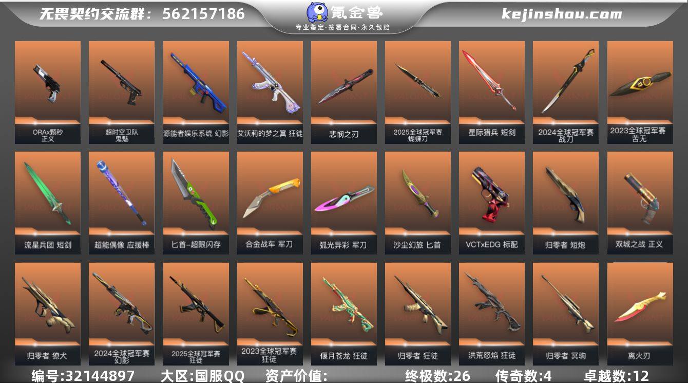 【WYF2558】终极*26/传奇*4/卓越*12/皮肤*131/等级*280/段位:白银/2025全球冠军赛/2024全球冠军赛套装/2023全球冠军赛套装/无畏契约季前邀请赛套装/离火刃套装/《双城之战》收藏套装/归零者套装/VCTCN2025套装/盖世英雄套装/幻棱/炼狱/维斯/暮蝶/钛狐/壹决/铁臂/捷风/雷兹/幽影/不死鸟/贤者/猎枭/蝰蛇/零/芮娜/奇乐/尚勃勒/霓虹/斯凯/夜露/星礈/K/O/海神/盖可/黑梦/钢锁/2025全球冠军赛 蝴蝶刀/战刀-2024全球冠军赛/苦无-2023全球冠军赛/无畏契约季前邀请赛 悲悯之刃/离火刃/黑波之刃/短剑-流星兵团/超能偶像 应援棒/匕首-超限闪存/定海神珍/军刀-合金战车/军刀-弧光异彩/匕首-沙尘幻旅/生物收割器/星际猎兵 短剑/2025全球冠军赛 狂徒/狂徒-2023全球冠军赛/狂徒-归零者/狂徒-洪荒怒焰/狂徒-偃月苍龙/狂徒-艾沃莉的梦之翼/狂徒-盖世英雄/狂徒-盖亚的复仇/狂徒-海洋之星/狂徒-无人之境/狂徒-耀鳞威龙/狂徒-紫阙金琅/狂徒-超能偶像/狂徒-弧光异彩/狂徒-流星兵团/狂徒-沙尘幻旅/幻影-2024全球冠军赛/幻影-源能者娱乐系统/幻影-侦察力量/幻影-超限闪存/幻影-合金战车/幻影-噬源兽防卫工程/幻影-聚合之力/戍卫-超能偶像/戍卫-彩梦之城/戍卫-浮光跃金/戍卫-花漾粉红/戍卫-萌彩剪影/戍卫-战术熊与伙伴们/獠犬-归零者/獠犬-弧光异彩/獠犬-采蜜小蜂队/獠犬-胡桃狂想/獠犬-模拟赫兹/獠犬-数码咒术/冥驹-归零者/冥驹-盖世英雄/冥驹-胡桃狂想/冥驹-花漾粉红/冥驹-模拟赫兹/飞将-合金战车/飞将-沙尘幻旅/飞将-聚合之力/飞将-信手涂鸦/飞将-战术熊与伙伴们/莽侠-超限闪存/莽侠-纤云弄巧/战神-盖世英雄/战神-采蜜小蜂队/战神-浮光跃金/战神-萌彩剪影/战神-数码咒术/奥丁-流星兵团/奥丁-信手涂鸦/判官-超能偶像/判官-采蜜小蜂队/判官-萌彩剪影/判官-数码咒术/雄鹿-离子武器/雄鹿-彩梦之城/雄鹿-模拟赫兹/骇灵-流星兵团/骇灵-沙尘幻...