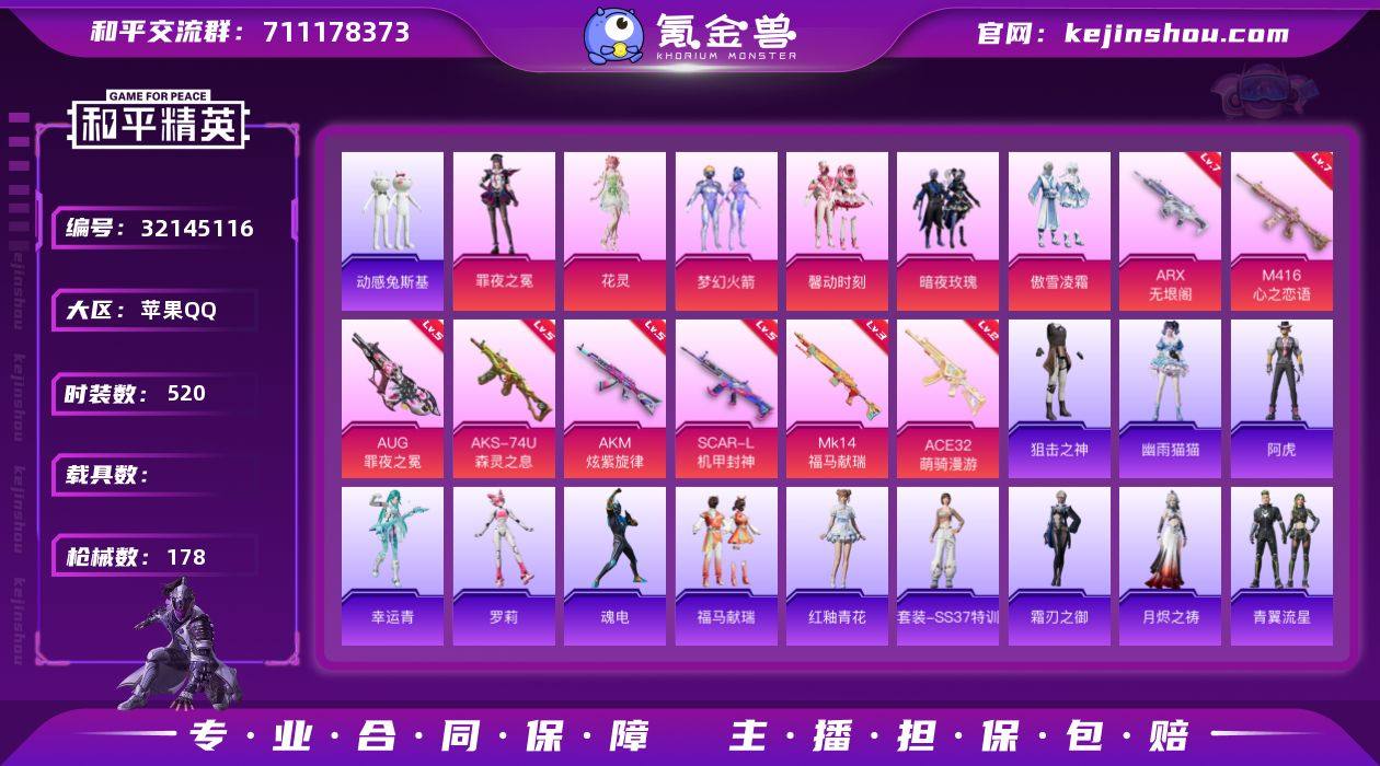 时装数: 520 枪械数: 178 战备数: 137 热门装扮: 梦幻火箭(新101),爱崽白熊,馨动时刻,暗夜玫瑰,傲雪凌霜,潮萌小黄鸭,动感兔斯基,兔兔白日梦,暗夜魅影,花灵,罪夜之冕 稀有枪皮:AKM-炫紫旋律(五级),SCAR-L-机甲封神(五级),M416-心之恋语(七级),AUG-罪夜之冕(五级),ACE32-萌骑漫游(二级),ARX-无垠阁(七级),AKS-74U-森灵之息(五级),Mk14-福马献瑞(三级)