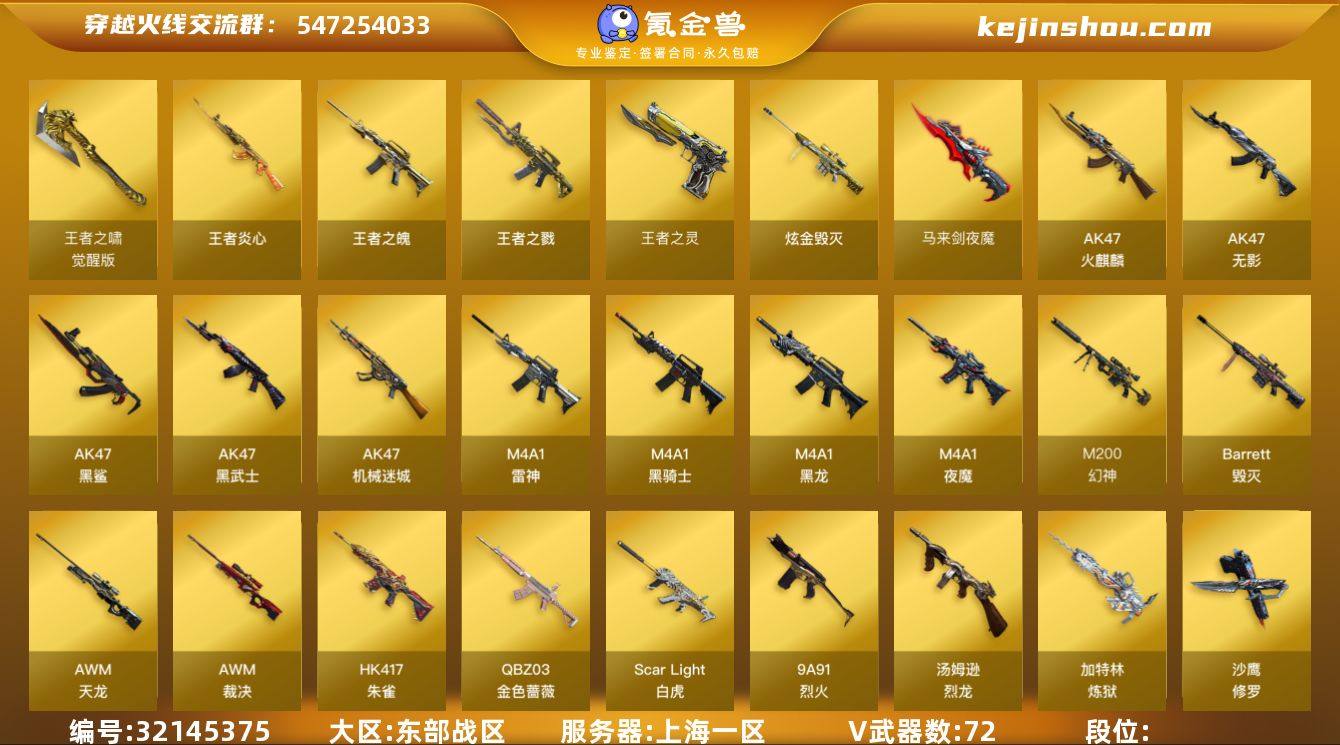东部战区(上海一区)lb【生化爆破号】72v【竞技荣光套装,Kar98K-星神套装+皮/傲竹金蛇,古蛇迷踪套装,QBZ-金色蔷薇+皮/破浪逐光,AWM-裁决,炽芒蝶刃,5烈龙+死亡之眼,破空枪刃-夜魔,丛林匕首-玄豹,朱雀-蛇隐宗,Colt1911-大黄蜂,Colt1911-小故障,猫猫手套】6王者【王者之心,王者之力,王者之怒,王者之魂,王者之击,炼狱-悦蓝】2炫金【炫金黑龙,炫金天龙】9角色【四防电竞教官-云悠悠,魅影,葵,零,蛇隐宗,乔伊教练,修道士,葵-阿尔法武装,战地猎狐】5音效【Kar98K-星神音效卡,M4A1-雷神音效卡,AK47-火麒麟音效卡,AWM-昌龙-怀旧音效卡,炼狱-百战金芒-庆典舞曲音效卡】22皮【星神-傲竹金蛇,金色蔷薇-破浪逐光,龙啸-蛇姬,屠龙-破浪逐光,火麒麟-百城,天龙-秘银,雷神-化蛇,修罗-耀金,毁灭-耀金,炼狱-月,毁灭-星空,麒麟刺-月,黑骑士-破界,火麒麟-平天大圣,雷神-虎将,屠龙-春桃,火麒麟-CF STAR,修罗-CF STAR】挑战枪【机甲撕裂者III,末日审判者III,封神放逐者III,KAC-圣炎切割者III,试炼破坏者III】 截图展示段位不代表实际段位 如赛季更新等不可抗拒因素发生变化、时限道具不保证所剩时间