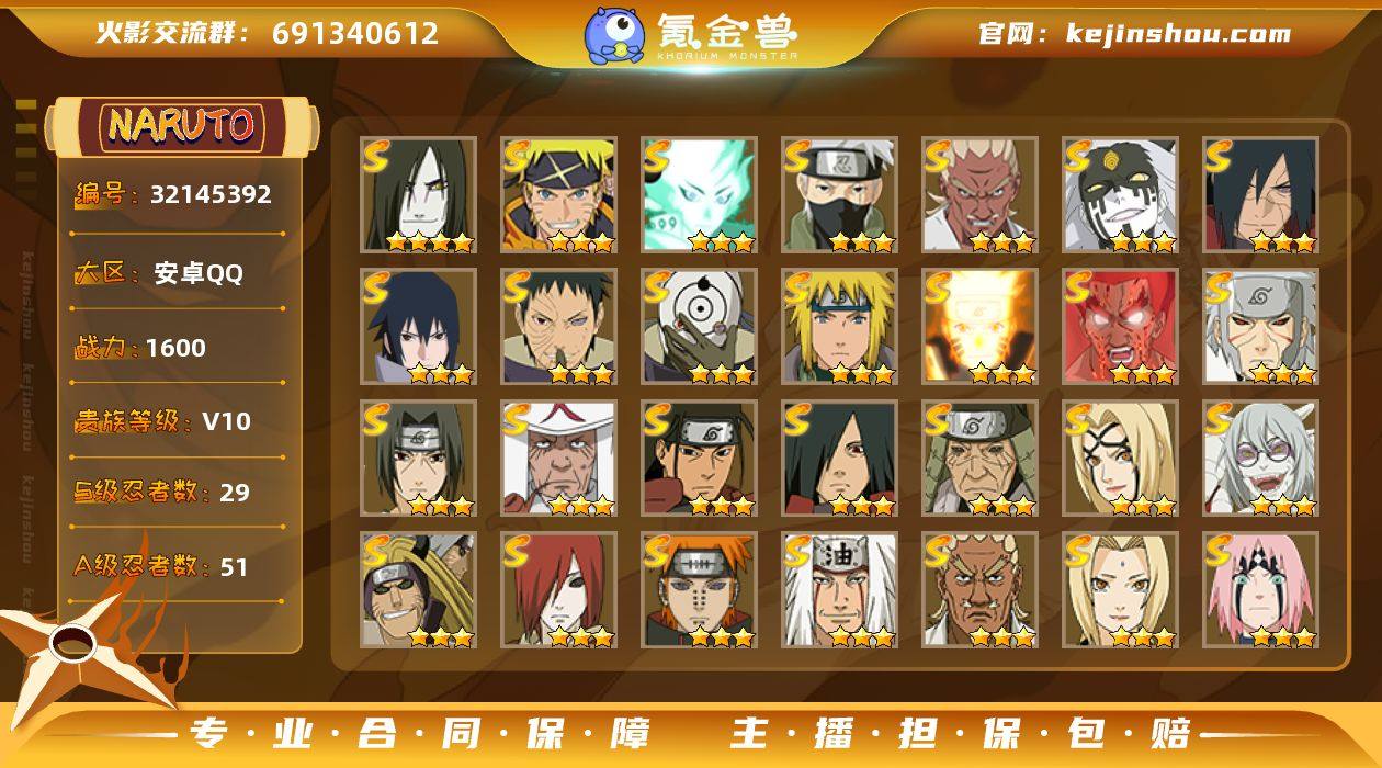 【低价多忍者活动号 多碎片】y6977 战力1600w 29s 51a 1个298a 1400金币 25忍法帖已开41级 四星大蛇丸 78片传说自来也 76片金水 31片秽土鼬 89片须佐止水 48片面具男 57片十尾带土 71片烈斗 45片小胡子
