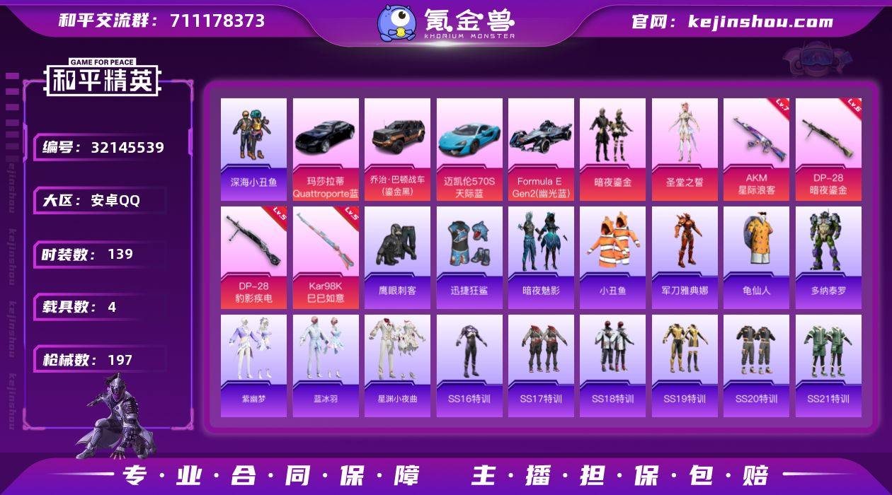 安卓【小号 AKM-星际浪客(七级)/ACE32-萌骑漫游(三级)/龟仙人/暗夜鎏金】 手Q-2粉装-6特效枪-4载具-3粉色飞行器-63112热力值-7王牌印记-139套装-197枪皮 【热门品类】:套装-深海小丑鱼,套装-小丑鱼,角色-军刀雅典娜,套装-龟仙人 【粉色套装】:粉装-暗夜鎏金,角色-圣堂之誓 【粉色枪皮等级】:AKM-星际浪客(七级),ACE32-萌骑漫游(三级),Kar98K-巳巳如意(五级),Mk14-福马献瑞(五级),DP-28-暗夜鎏金(六级),DP-28-豹影疾电(五级) 【粉色载具】:玛莎拉蒂Quattroporte(夜幕蓝),乔治巴顿战车(鎏金黑),迈凯伦570S(天际蓝),Formula E Gen2(幽光蓝) 【粉色枪皮】:AKM-星际浪客,ACE32-萌骑漫游,Kar98K-巳巳如意,Mk14-福马献瑞,DP-28-暗夜鎏金,DP-28-豹影疾电 【粉色飞行器】:炫彩糖果飞行器,梦幻舞会飞行器,霓虹漫游飞行器 【粉色降落伞】:荒漠赏金降落伞,环太平洋降落伞,垂柳戏鸭降落伞,纯梦嫁纱降落伞,龙珠超降落伞,天星战神降落伞,炫光之旅降落伞,猪猪侠降落伞,江南烟雨降落伞,忍者神龟降落伞,炫彩糖果降落伞 【稀有套装】:套装-龟仙人,套装-雪国风尚,套装-炫彩糖果,套装-马上有钱,角色-多纳泰罗,套装-紫幽梦,套装-蓝冰羽,套装-星渊小夜曲,套装-雨过天青,套装-红釉青花 【稀有枪皮】:AKM-影袭,AKM-缤纷海域,AKM-萌趣颜团子,AKM-虎虎生威,AKM-龙的传人,M16A4-幻世战舞者,M16A4-蓝色火焰,SCAR-L-夜灯,SCAR-L-炫彩节奏,SCAR-L-玉兔迎春,SCAR-L-黄金龙骨,M416-糯团青竹,M416-绯红前夜,M416-蓝色火焰,GROZA-彩虹符号,GROZA-影袭,GROZA-懵萌河马,GROZA-田园牧歌,AUG-耀粉歌者,QBZ-彩虹符号,QBZ-洛神天依,M762-天降萌叽,M762-暗夜鎏金,M762-牛气冲天,M762-瑞龙福将,M762-第五大道,Mk47-妙红点点,G36C-懵萌河马,G36C-时空追击者,AC-VAL-天降...