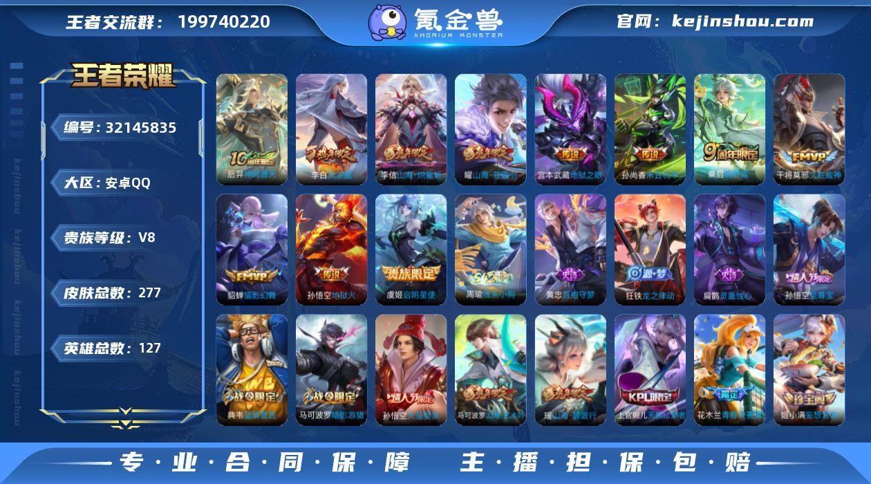 【mwz232】安卓Q-V8-永恒钻石III段位-127英雄-277皮肤-11传说-66史诗 【英雄全皮】:鬼谷子全皮,空空儿全皮 【传说皮肤】:后羿神树通天,桑启鸣野蒿,曜山海苍雷引,李信山海炽霜斩,虞姬启明星使,貂蝉猫影幻舞,干将莫邪久胜战神,李白凤求凰,孙尚香末日机甲,宫本武藏地狱之眼,孙悟空地狱火 【限定皮肤】:白起狰,姜子牙天穹之誓,狄仁杰阴阳师,赵云皇家上将,嬴政白昼王子,孙尚香蔷薇恋人,鲁班七号狮舞东方,高渐离死亡摇滚,阿轲迷踪丽影,芈月重明,吕布猎兽之王,周瑜赤莲之焰,夏侯惇朔风刀,甄姬游园惊梦,曹操烛龙,典韦穷奇,典韦蓝屏警告,马可波罗逐梦之星,马可波罗暗影游猎,马可波罗山海玄木吟,狄仁杰魔术师,狄仁杰万华元夜,达摩沙漠行僧,项羽海滩派对,老夫子醍醐杖,程咬金演武夺筹,刘邦夺宝奇兵,韩信飞衡,兰陵王驯魔猎人,兰陵王金庭之子,花木兰青春决赛季,孙悟空美猴王,孙悟空至尊宝,孙悟空大圣娶亲,牛魔御旌,李元芳银河之约,李元芳云中旅人,虞姬启明星使,钟馗神迹守卫,钟馗驱傩正仪,女娲朔望之晖,雅典娜单词大作战,雅典娜黎明之约,蔡文姬繁星吟游,太乙真人饕餮,鬼谷子原初探秘者,鬼谷子五谷丰年,苏烈千军破阵,百里玄策原初追逐者,弈星混沌棋,沈梦溪星空之诺,沈梦溪大漠名商,明世隐疑决卦,裴擒虎天狼狩猎者,裴擒虎李小龙,裴擒虎擒涛扼浪,狂铁御狮,米莱狄御霄,瑶山海碧波行,云中君纤云弄巧,李信山海炽霜斩,盾山御銮,猪八戒西部大镖客,上官婉儿梁祝,上官婉儿天狼绘梦者,嫦娥拒霜思,嫦娥暖冬兔眠,曜山海苍雷引,蒙犽狂想玩偶喵,桑启海盐诗旅,暃星界游侠,阿古朵江河有灵,鬼谷子天穹祈灯,姬小满妄想食味,沈梦溪龙舞盛年,刘邦剑破天穹,周瑜熔金海岸 【年限皮肤】:孙悟空美猴王,李白凤求凰,韩信飞衡,曜山海苍雷引,李信山海炽霜斩...