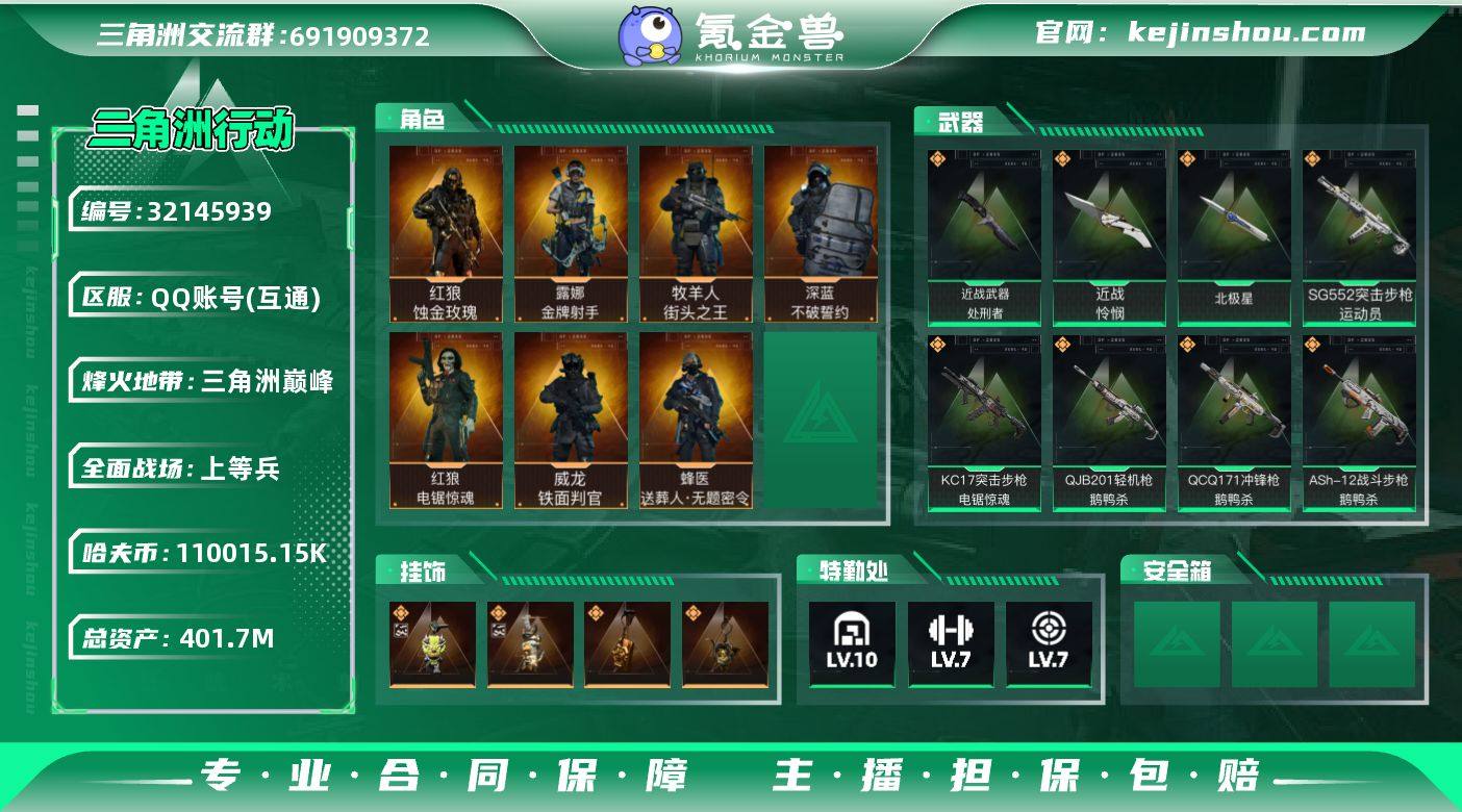 实名:可二次实名 总资产:401.7M 哈夫币:110015.15K 烽火地带段位:三角洲巅峰 烽火地带等级:60 全面战场段位:上等兵 全面战场等级:22 10级仓库,7级训练中心,7级靶场,6级指挥中心,3级潜水中心,3级防具台,3级工作台,3级制药台,3级技术中心,2级收藏室 战术部门等级:4 战斗部门等级:4 医疗部门等级:4 研发部门等级:4 后勤部门等级:4 曼德尔砖-气象感应:04 曼德尔砖-命运王牌:1 曼德尔砖-电玩高手:0 曼德尔砖-美杜莎:1