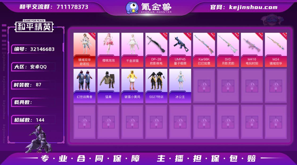 1红装 3粉装 6粉枪 87套装 144枪皮 7热门 镜域双华-欧若拉 超能勇士 滨海厨神 幻羽潜行 白熊同盟 天籁歌者 电音精灵 耀粉歌者 竞技名士 玉兔迎春 光之冒险 完美偶像 特殊使命 缤纷果语 角色-樱桃泡泡 角色-千金淑猫 M24-镜域双华(3级) S686-生命誓言 G36C-镜域双华 Famas-镜域双华 DBS-焰鹰斗篷 DP-28-焰鹰斗篷 MG3-镜域双华 AUG-耀粉歌者 S12K-玩趣呆呆 AUG-甜蜜菠萝 QBZ-洛神天依 蜜獾-天降萌叽 DP-28-彩虹符号 AUG-天降萌叽 S12K-夜灯 UMP45-夜灯 VSS-彩虹符号 UZI-炫彩节奏 AWM-焰鹰斗篷 Vector-焰鹰斗篷 MP5K-乌木金纹 UZI-天降萌叽 DBS-第五大道 SCAR-L-夜灯 Kar98K-洛神天依 SKS-炫彩节奏 S686-彩虹符号 SVD-月影灵韵(7级) Kar98K-巳巳如意(5级) M416-电玩时刻(5级) DP-28-豹影疾电(5级) UMP45-量子极限(5级) 破蛋小黄鸡 冰公主 SS27特训 Mk47-洛神天依 M762-彩虹符号 MG3-幻世战舞者 长空猛禽 幻海精灵飞行器 镜域双华-灵镜之阶 鸿潮鸣舰飞行器