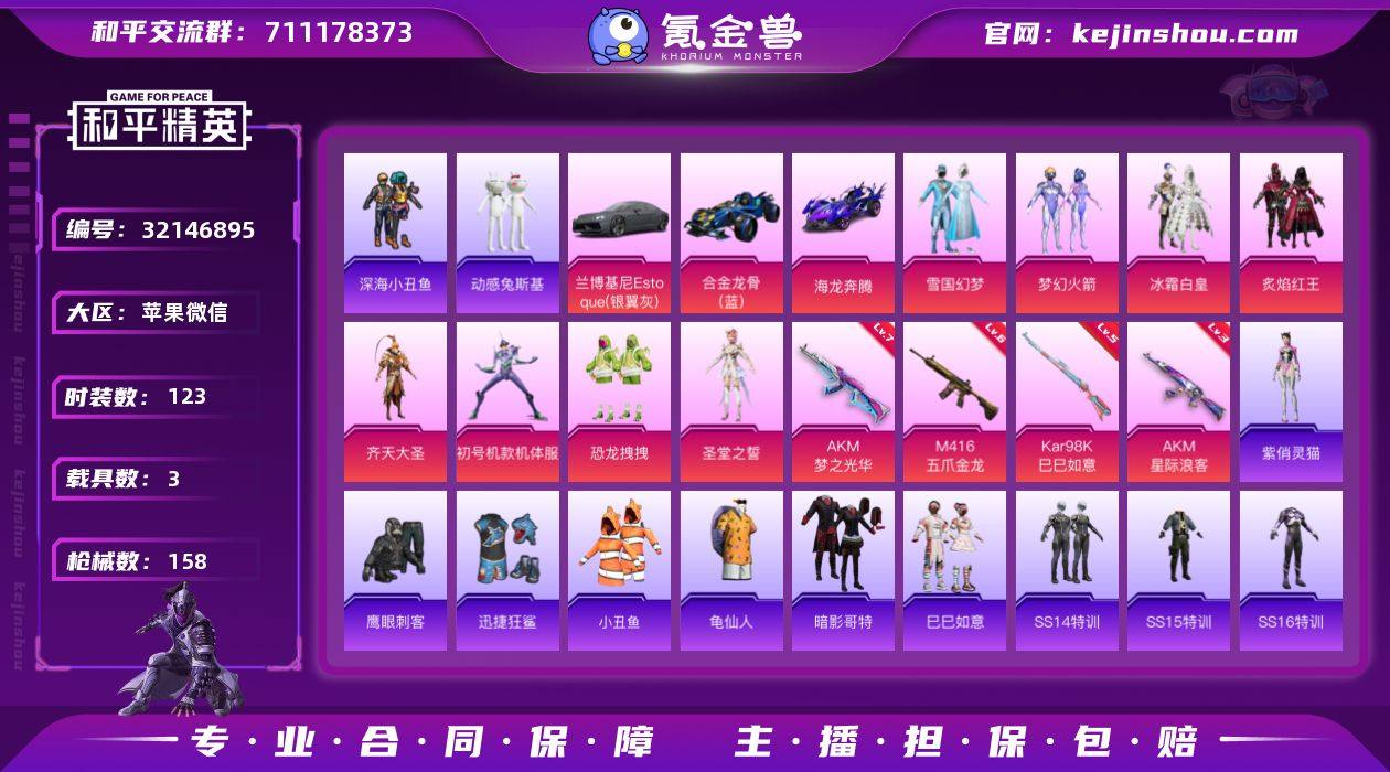 【AZH3026】苹果 微信【雪国梦幻火箭紫螳螂 深海小丑鱼暗影哥特兔斯基 满级梦之光华AKM 3载具】8粉装-4特效枪-3载具-2粉色飞行器-56183热力值-15王牌印记-123套装-158枪皮 【热门品类】:粉装-雪国幻梦,粉装-梦幻火箭,套装-深海小丑鱼,套装-小丑鱼,套装-动感兔斯基人偶服,套装-龟仙人,套装-暗影哥特 【粉色套装】:粉装-雪国幻梦,粉装-梦幻火箭,粉装-冰霜白皇,粉装-炙焰红王,粉装-齐天大圣,角色-初号机款机体服,粉装-恐龙拽拽,角色-圣堂之誓 【粉色枪皮等级】:AKM-梦之光华(七级),AKM-星际浪客(三级),M416-五爪金龙(六级),Kar98K-巳巳如意(五级) 【粉色载具】:兰博基尼Estoque(银翼灰),合金龙骨(蓝),海龙奔腾 【粉色枪皮】:AKM-梦之光华,AKM-星际浪客,M416-五爪金龙,Kar98K-巳巳如意 【粉色飞行器】:齐天大圣飞行器,镜光幻境飞行翼 【粉色降落伞】:梦幻火箭降落伞,神秘黑猫降落伞,蓝莓炮弹降落伞,碧影闪光降落伞,炙焰牛王降落伞,垂柳戏鸭降落伞,旋转彩虹降落伞,仲夏莫吉托降落伞,无垠阁降落伞,炫彩糖果降落伞 【稀有套装】:套装-龟仙人,套装-巳巳如意,角色-紫俏灵猫 【稀有枪皮】:AKM-墨染幽兰,AKM-夜灯,AKM-彩虹符号,AKM-缤纷海域,AKM-虎虎生威,AKM-霓虹街区,M16A4-甜心亚梦,SCAR-L-暗夜玫瑰,SCAR-L-炫彩节奏,SCAR-L-青丘仙客,SCAR-L-龙宫之主,M416-糯团青竹,M416-红色方程式,M416-绯红前夜,M416-蓝色火焰,GROZA-异彩先驱,GROZA-彩虹符号,GROZA-田园牧歌,AUG-天降萌叽,AUG-青春冒险家,QBZ-洛神天依,QBZ-飞驰魅影,M762-天降萌叽,M762-奇异狩猎者,M762-彩虹符号,M762-瑞龙福将,M762-绯红前夜,Mk47-妙红点点,G36C-暗夜玫瑰,G36C-炙焰牛王,AC-VAL-快闪甜心,AC-VAL-甜心亚梦,蜜獾-天降萌叽,蜜獾-娇憨猪猪,UZI-天降萌叽,UZI-娇憨猪猪...