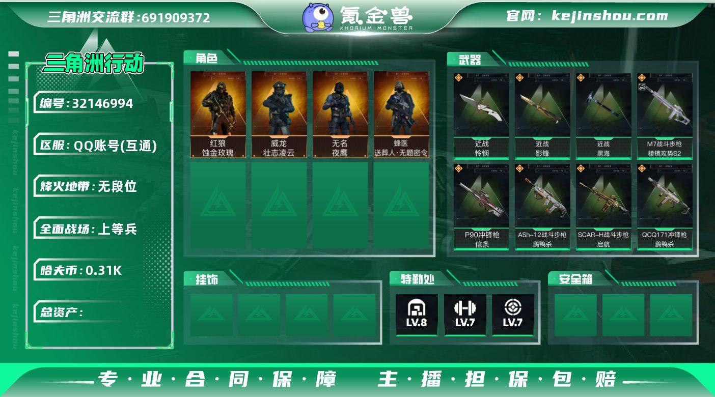 门刀皮号,五刀+双红+单枪,怜悯+暗星+黑海+影锋+信条+蚀金玫瑰+凌霄戍卫,M7战斗步枪-棱镜攻势S2(优品B)】【【无二次协助处理】】-特勤处:仓库8级/靶场7级/训练中心7级-167m总资产-31w哈伏币-60烽火等级-黑鹰-25战场等级-上等兵 【干员外观】:红狼-蚀金玫瑰,威龙-凌霄戍卫,威龙-壮志凌云,蜂医-送葬人·无题密令,无名-夜鹰,深蓝-不破誓约,红狼-电锯惊魂,露娜-金牌射手,乌鲁鲁-荒原猎手 【近战皮肤】:近战-暗星,近战-信条,近战-黑海,近战-影锋,近战-怜悯,近战-黑鹰 【典藏外观】:M7战斗步枪-棱镜攻势S2 【典藏外观成色】:M7战斗步枪-棱镜攻势S2(优品B) 【传说外观】:M4A1突击步枪-蚀金玫瑰,M4A1突击步枪-阿米娅,QBZ95-1突击步枪-凌霄戍卫,ASh-12战斗步枪-鹅鸭杀,M7战斗步枪-神秘艺术,SG552突击步枪-运动员,AK-12突击步枪-夜鹰,AK-12突击步枪-特斯拉线圈,SCAR-H战斗步枪-铁艺苍穹,SCAR-H战斗步枪-启航,SCAR-H战斗步枪-荼蘼,G3战斗步枪-骑士,CAR-15突击步枪-黑鹰坠落,CAR-15突击步枪-阿米娅,AS Val突击步枪-蛇年祥瑞,腾龙突击步枪-捞点薯条,腾龙突击步枪-万金泪冠,KC17突击步枪-电锯惊魂,47突击步枪-暗星,P90冲锋枪-信条,UZI冲锋枪-特斯拉线圈,SMG-45冲锋枪-骑士,SR-3M紧凑突击步枪-特斯拉线圈,SR-3M紧凑突击步枪-暗星,SR-3M紧凑突击步枪-荼蘼,勇士冲锋枪-能天使-午夜邮差,勇士冲锋枪-万金泪冠,QCQ171冲锋枪-鹅鸭杀,725双管霰弹枪-送葬人-无题密令,PKM通用机枪-荼蘼,M250通用机枪-骑士之心,QJB201轻机枪-鹅鸭杀,M14射手步枪-蛮荒,M14射手步枪-缄花,SKS射手步枪-骑士,SR-25射手步枪-水墨云图,SR-25射手步枪-信条,SR-25射手步枪-缄花,AWM狙击步枪-捞点薯条,AWM狙击步枪-万金泪冠,.357左轮-缄花,93R-捞点薯条,复合弓-黑·天际线
