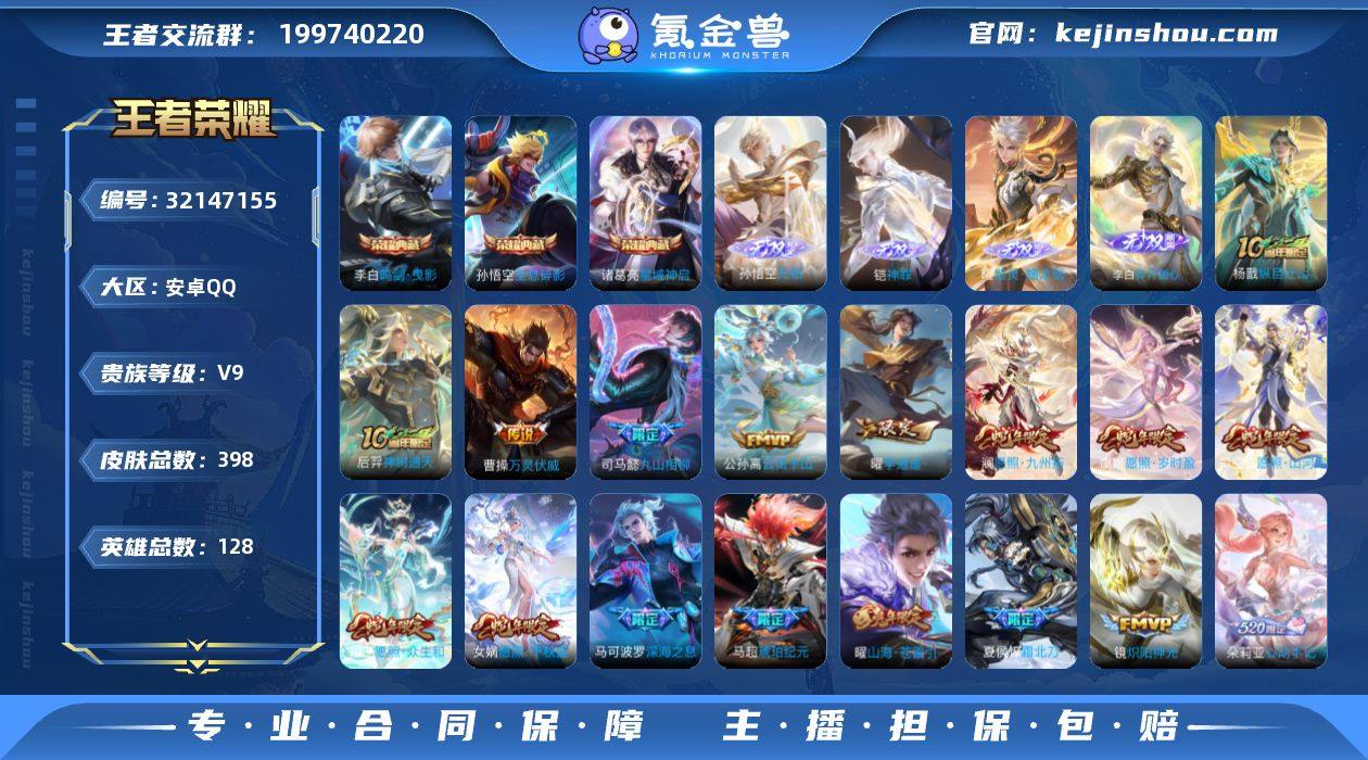 安卓Q-V9-最强王者段位-128英雄-398皮肤-3典藏皮肤-4无双-32传说-111史诗 【英雄全皮】:司马懿全皮,孙权全皮,狂铁全皮,盾山全皮,敖隐全皮,司空震全皮,莱西奥全皮,空空儿全皮,影全皮 【荣耀典藏】:孙悟空全息碎影,李白鸣剑曳影,诸葛亮星域神启 【无双皮肤】:孙悟空无相,铠神罪,曜器灵螭龙剑,李白碎月剑心 【传说皮肤】:杨戬纵目迁山,后羿神树通天,曹操万灵伏威,司马懿九山相柳,公孙离云诺千山,司空震愿照山河定,女娲愿照千秋盛,妲己愿照众生和,澜愿照九州拓,虞姬愿照岁时盈,云缨幻光神枪,裴擒虎祥瑞亨通,嬴政玄雷天君,夏侯惇霜北刀,朵莉亚心动手记,马超琥珀纪元,干将莫邪画中仙,曜山海苍雷引,李白诗剑行,马可波罗深海之息,马超无双飞将,孙策末日机甲,曜李逍遥 ,周瑜音你心动,铠绛天战甲,镜炽阳神光,虞姬启明星使,达摩黄金狮子座,孙尚香末日机甲,宫本武藏地狱之眼,孙悟空地狱火,狄仁杰超时空战士 【限定皮肤】:白起狰,夏侯惇霜北刀,蔡文姬夏日便利店,虞姬夏日便利店,狄仁杰阴阳师,赵云皇家上将,赵云引擎之心,嬴政优雅恋人,鲁班七号狮舞东方,庄周高山流水,阿轲迷踪丽影,钟无艳超时空战士,孙膑妖精王,扁鹊炼金王,白起夜都怪侠,芈月重明,芈月幻夜卜梦,吕布猎兽之王,吕布御风骁将,周瑜赤莲之焰,元歌云间偶戏,元歌无心,夏侯惇朔风刀,甄姬落雪兰心,曹操烛龙,典韦蓝屏警告,马可波罗暗影游猎,马可波罗深海之息,狄仁杰魔术师,狄仁杰万华元夜,达摩沙漠行僧,项羽海滩派对,老夫子醍醐杖,程咬金演武夺筹,刘邦夺宝奇兵,韩信傲雪梅枪,王昭君午后时光,兰陵王驯魔猎人,兰陵王金庭之子,亚瑟潮玩骑士王,牛魔御旌,后羿圣弓游侠,李元芳银河之约,李元芳云中旅人,虞姬启明星使,钟馗神迹守卫,钟馗驱傩正仪,杨玉环遇见飞天,女娲朔望之晖,...