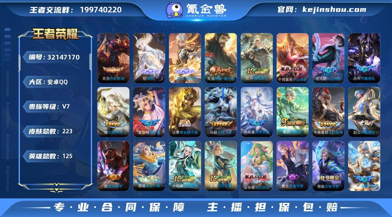 安卓Q-V7-永恒钻石IV段位-125英雄-223皮肤-1典藏皮肤-2无双-14传说-64史诗 【英雄全皮】:孙权全皮,夏洛特全皮 【荣耀典藏】:关羽赤影疾锋 【无双皮肤】:铠神罪,曜器灵螭龙剑 【传说皮肤】:关羽神骥镇沧海,后羿神树通天,干将莫邪千山共赴,司马懿九山相柳,桑启鸣野蒿,夏洛特浮生妄,马超无双飞将,孙尚香异界灵契,赵云淬星耀世,铠绛天战甲,镜炽阳神光,干将莫邪久胜战神,达摩黄金狮子座,吕布天魔缭乱 【限定皮肤】:蒙犽顽岩魄,姜子牙天穹之誓,狄仁杰阴阳师,赵云皇家上将,赵云引擎之心,墨子神迹守卫,嬴政优雅恋人,孙尚香异界灵契,庄周高山流水,高渐离玩趣恶龙,吕布天魔缭乱,元歌无心,狄仁杰魔术师,狄仁杰万华元夜,达摩沙漠行僧,项羽海滩派对,项羽霸王别姬,老夫子醍醐杖,老夫子航海奇遇记,兰陵王金庭之子,孙悟空至尊宝,牛魔御旌,李元芳银河之约,李元芳云中旅人,钟馗驱傩正仪,杨玉环寅虎心曲,女娲朔望之晖,蔡文姬繁星吟游,鬼谷子原初探秘者,鬼谷子五谷丰年,铠青龙志,苏烈千军破阵,弈星混沌棋,梦奇顽趣,沈梦溪星空之诺,沈梦溪大漠名商,明世隐疑决卦,裴擒虎李小龙,裴擒虎擒涛扼浪,狂铁御狮,米莱狄御霄,云中君纤云弄巧,盾山御銮,猪八戒猪悟能,嫦娥拒霜思,鲁班大师探海日志,桑启海盐诗旅,夏洛特浮生妄,张良古海寻踪,蒙恬荣光圣徽,鬼谷子天穹祈灯,沈梦溪龙舞盛年,刘邦剑破天穹,程咬金群星魔术团,周瑜熔金海岸 【年限皮肤】:铠青龙志,杨玉环寅虎心曲 【赛季限定】:狂铁御狮,米莱狄御霄,牛魔御旌,盾山御銮,弈星混沌棋,明世隐疑决卦,老夫子醍醐杖,鬼谷子原初探秘者,狄仁杰万华元夜,钟馗驱傩正仪,苏烈千军破阵,达摩沙漠行僧,兰陵王金庭之子,沈梦溪大漠名商,李元芳云中旅人,桑启海盐诗旅,裴擒虎擒涛扼浪,鲁班大师探海日志,张良古海...