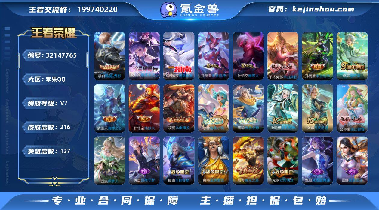 苹果Q-V7-最强王者段位-127英雄-216皮肤-小魔方已亮-1典藏皮肤-2珍品传说-5传说-54史诗,中路29段,游走22,发育路27幸运值232 【英雄全皮】:孙权全皮,敖隐全皮 【荣耀典藏】:李白鸣剑曳影 【珍品传说】:安琪拉酷洛米之心,马可波罗怪盗基德 【传说皮肤】:干将莫邪千山共赴,桑启鸣野蒿,孙尚香末日机甲,孙悟空地狱火,武则天海洋之心 【限定皮肤】:姜子牙天穹之誓,狄仁杰阴阳师,赵云皇家上将,嬴政白昼王子,鲁班七号狮舞东方,吕布猎兽之王,元歌云间偶戏,夏侯惇朔风刀,曹操烛龙,典韦穷奇,典韦蓝屏警告,狄仁杰魔术师,狄仁杰万华元夜,项羽海滩派对,老夫子醍醐杖,程咬金演武夺筹,牛魔御旌,后羿辉光之辰,钟馗神迹守卫,钟馗驱傩正仪,女娲朔望之晖,干将莫邪胡桃夹子,雅典娜黎明之约,蔡文姬繁星吟游,太乙真人饕餮,太乙真人华丽摇滚,鬼谷子原初探秘者,苏烈千军破阵,百里玄策原初追逐者,弈星混沌棋,梦奇顽趣,明世隐疑决卦,裴擒虎李小龙,狂铁御狮,米莱狄御霄,盾山御銮,戈娅驭风魔法,妲己灵卜魔法,刘邦剑破天穹,镜青焰无极,项羽苍威无极,周瑜熔金海岸 【年限皮肤】:后羿辉光之辰 【赛季限定】:太乙真人饕餮,曹操烛龙,典韦穷奇,狂铁御狮,米莱狄御霄,牛魔御旌,盾山御銮,夏侯惇朔风刀,弈星混沌棋,明世隐疑决卦,老夫子醍醐杖,鬼谷子原初探秘者,狄仁杰万华元夜,程咬金演武夺筹,钟馗驱傩正仪,苏烈千军破阵,刘邦剑破天穹,姜子牙天穹之誓,东皇太一噬灭天穹,钟馗虚灵犬护,甄姬逆浪荇歌,亚瑟荣光之誓,百里玄策原初追逐者,雅典娜黎明之约,梦奇顽趣,牛魔星界战将,项羽九幽镇关 【战令限定】:嬴政白昼王子,吕布猎兽之王,典韦蓝屏警告,女娲朔望之晖,鲁班七号狮舞东方,钟馗神迹守卫,元歌云间偶戏,戈娅驭风魔法,妲己灵卜魔法,镜青焰无极,项羽苍威无极...
