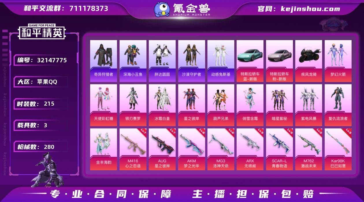 苹果 【素材号 梦幻火箭/浪漫天命/深海小丑鱼/奇异狩猎者/暗影哥特/AKM-梦之光华(六级)/SCAR-L-青春物语(五级)/M416-心之恋语(七级)/M416-墨龙九天(三级)/特斯拉Roadster(水滴蓝)/特斯拉Roadster(沁心粉)】手Q-11粉装-11特效枪-3载具-4粉色飞行器-102898热力值-16王牌印记-215套装-280枪皮 【热门品类】:粉装-梦幻火箭,套装-浪漫天命,套装-深海小丑鱼,套装-小丑鱼,套装-奇异狩猎者,套装-胖达圆圆,套装-沙漠守护者,套装-动感兔斯基人偶服,套装-龟仙人,套装-暗影哥特 【粉色套装】:粉装-天使彩虹糖,粉装-梦幻火箭,粉装-银刃赛罗,粉装-冰霜白皇,粉装-星之彼岸,粉装-葫芦兄弟,粉装-俏雪含霜,粉装-暗星紫秘,粉装-紫电风暴,角色-复仇流浪者,粉装-金丰海韵 【粉色枪皮等级】:AKM-梦之光华(六级),SCAR-L-青春物语(五级),M416-心之恋语(七级),M416-墨龙九天(三级),AUG-星之彼岸(七级),M762-激战未来(五级),ARX-无垠阁(五级),AKS-74U-森灵之息(五级),Kar98K-巳巳如意(五级),SLR-暗夜玫瑰(四级),MG3-洛神天依(六级) 【粉色载具】:特斯拉Roadster(水滴蓝),特斯拉Roadster(沁心粉),疾风龙骑,空客H135-蔚蓝之翼 【粉色枪皮】:AKM-梦之光华,SC...