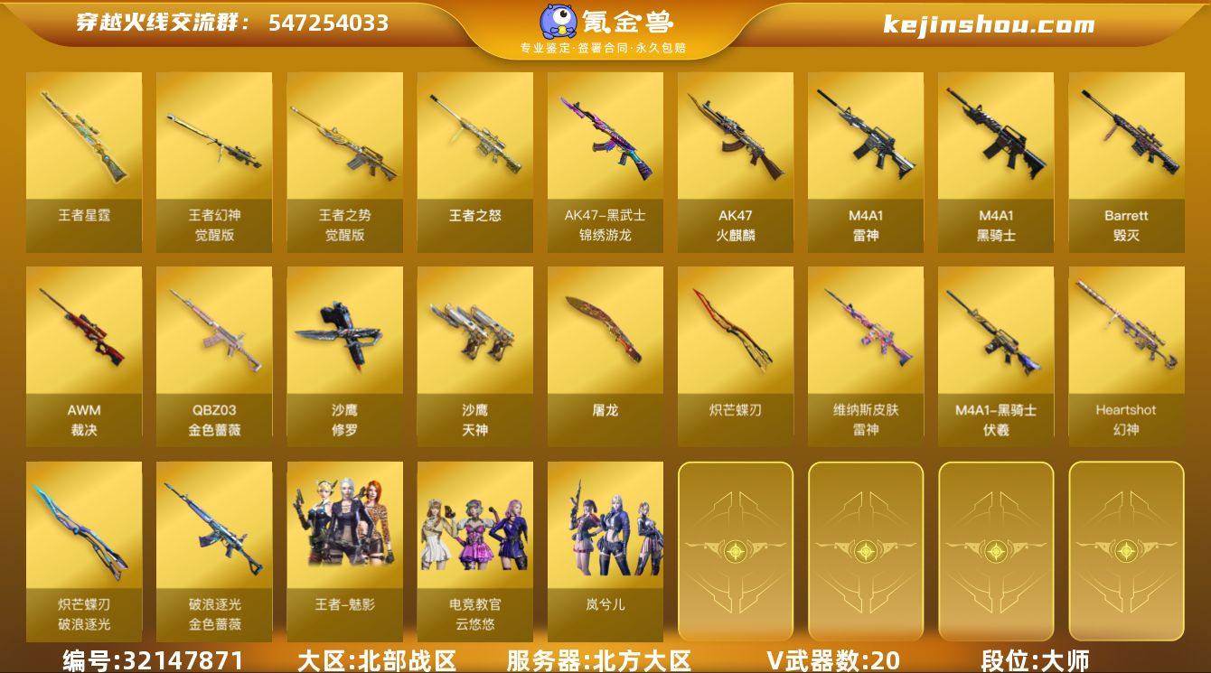 【ky6081】北方大区-28V-9王者武器数-0炫金武器数 【热门武器】:QBZ03-金色蔷薇,M4A1-黑骑士,沙鹰-修罗,炽芒蝶刃*2,炽芒蝶刃-破浪逐光 皮肤 【王者炫金武器】:王者之怒,王者星霆 【皮肤】:幻神-Heartshot 皮肤,金色蔷薇-破浪逐光 皮肤,雷神-维纳斯皮肤,黑骑士-伏羲,炽芒蝶刃-破浪逐光 皮肤 【角色】:电竞教官-云悠悠,岚兮儿,王者-魅影,暗夜-X,兰-新年限定,猎狐者-追月,0号玩家,雪莉杨-摸金校尉,樱-战斗天使 【人偶武器】:Scar Light-马枪 【英雄级武器】:AK47-火麒麟,M4A1-雷神,M4A1-黑骑士,黑武士-锦绣游龙,QBZ03-金色蔷薇,王者之势-觉醒版,Barrett-毁灭,AWM-裁决,王者幻神-觉醒版,沙鹰-修罗,沙鹰-天神*2,屠龙,炽芒蝶刃*2,高爆手雷-竞技荣光,高爆手雷-云龙,高爆手雷-雷霆王者-觉醒版*2,闪光弹-竞技荣光,闪光弹-云龙*2,闪光弹-雷霆王者-觉醒版,烟雾弹-竞技荣光,烟雾弹-云龙,烟雾弹-雷霆王者-觉醒版*2 【道具】:CFS限定背包,EP战队炫彩背包,云海游龙炫彩背包,老虎背包,超级背包,绿色巨人,灵魂忍者,迷雾幽灵,夺命之镰,防化服*2,枪王排位28赛季金色流光,EP战队名片,EP战队喷图,EP战队击杀图标,防弹头盔*2,防弹衣*2,C4工具钳*2,手雷包*2 【特殊枪械】:1黑骑士