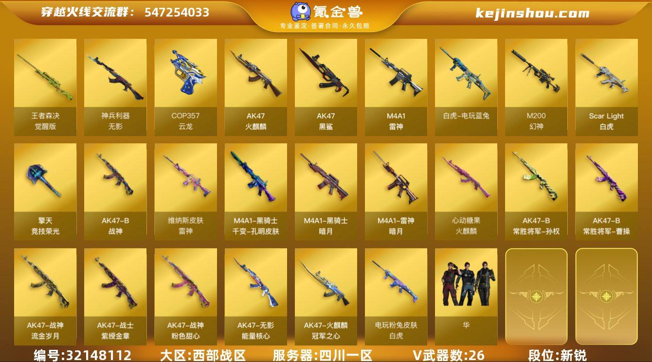 四川一区-28V-1王者武器数-0炫金武器数 【热门武器】:Scar Light-白虎,M200-幻神,白虎-电玩蓝兔 【音效卡】:M200-幻神音效卡 【皮肤】:白虎-电玩粉兔皮肤,雷神-暗月,雷神-维纳斯皮肤,火麒麟-冠军之心,火麒麟-心动糖果,M4A1-千变-孔明皮肤,黑骑士-暗月,无影-能量核心,战神-粉色甜心皮肤,战神-紫绶金章皮肤*2,战神-流金岁月皮肤,AK47-B-常胜将军-曹操,AK47-B-常胜将军-孙权 【角色】:华,初恋灵狐,芳心审判者,飞虎队-X,风暴女,虎妞,嘉年华灵狐,灵狐-花神,龙儿,麻雀,斯沃特-X,铁骑荣耀 【人偶武器】:AWM-灵狐-15周年嘉年华,海滩汪汪-巴雷特,迷你深渊冰龙,迷你裂空之翼,迷你波特博士*3,夺魂,迷你牛牛,迷你火种*2,迷你超能女侍 【挑战大师】:神圣爆裂者III,冰龙粉碎者-白马银枪,VEPR-12-金魔,激光毁灭者III*2,机甲撕裂者III,试炼破坏者III,神圣爆裂者-末日III,阐释者III 【英雄级武器】:AK47-火麒麟*2,M4A1-雷神,AK47-黑鲨,Scar Light-白虎,无影-神兵利器,AK47-B-战神,白虎-电玩蓝兔,M200-幻神,王者森决-觉醒版,COP 357-云龙*3,擎天-竞技荣光*2,高爆手雷-竞技荣光*2,高爆手雷-云龙*2,闪光弹-竞技荣光*2,闪光弹-云龙*2,烟雾弹-竞技荣光*2,烟雾弹-云龙*2 【道具】:背包-洛丽塔,虎牙炫彩背包,夺命之镰,防化服,金色流光-枪王排位*2,星辰流光-枪王排位,枪王排位28赛季金色流光,电玩兔兔表情,EP战队名片,防弹头盔*2,防弹衣*2,C4工具钳*2,手雷包*2 【特殊枪械】:1白虎