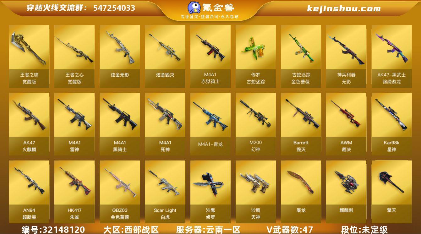 云南一区-54V-13王者武器数-2炫金武器数 【热门武器】:QBZ03-金色蔷薇,Scar Light-白虎,HK417-朱雀,M4A1-青龙,M200-幻神,金色蔷薇-古蛇迷踪,修罗-古蛇迷踪,死亡之眼,Kar98K-星神,M4A1-黑骑士,沙鹰-修罗*2 【王者炫金武器】:炫金无影,炫金毁灭 【音效卡】:M4A1-黑骑士音效卡,Kar98K-星神音效卡,Barrett-碧霄极光音效卡 【皮肤】:幻神-周瑜皮肤,白虎-虎啸皮肤,雷神-化蛇 皮肤,雷神-神秘按键 皮肤,火麒麟-平天大圣,毁灭-黑大圣皮肤,毁灭-虹光风暴 皮肤,黑龙-暗月,死神-秘银,战神-粉色甜心皮肤,战神-紫绶金章皮肤,AK47-B-常胜将军-曹操,AK47-B-常胜将军-刘备,AK47-B-常胜将军-孙权,天神-暗月,屠龙-荣耀之锋,屠龙-星耀 皮肤 【角色】:星际战将,零·纪元,王者-葵-貂蝉,蛇隐宗,乔伊教练,灵狐者-X,灵狐者-黄金海岸,麻雀,曼陀罗-X,萌儿,娜塔莉娅,潘多拉-X,蛇姬,兔囡囡,维纳斯,新娜塔莎,游珑儿 【人偶武器】:AWM-灵狐-15周年嘉年华,闪光弹-貂蝉,高爆手雷-大乔 【暴走生化】:死亡之眼,超级对讲机 【英雄级武器】:AK47-火麒麟,M4A1-雷神,M4A1-黑骑士,M4A1-死神,AN94-超新星,M4A1-青龙,HK417-朱雀,Scar Light-白虎,无影-神兵利器,黑武士-锦绣游龙,金色蔷薇-古蛇迷踪,QBZ03-金色蔷薇,王者之心-觉醒版,王者之魄-觉醒版,AK47-B-常胜将军,机械迷城-穹宇,Barrett-毁灭,AWM-裁决,M200-幻神,Kar98K-星神,沙鹰-修罗*2,沙鹰-天神*2,COP 357-雷霆王者-觉醒版,柯尔特-竞技荣光,修罗-古蛇迷踪,屠龙,擎天,麒麟刺,擎天-竞技荣光,王者之啸-觉醒版*2,高爆手雷-竞技荣光*5,高爆手雷-古蛇迷踪,高爆手雷-雷霆王者-觉醒版,闪光弹-竞技荣光*3,闪光弹-云龙,闪光弹-雷霆王者-觉醒版,烟雾弹-竞技荣光*3,烟雾弹-云龙,烟雾弹-古蛇迷踪,M4A1-赤狱骑士,B