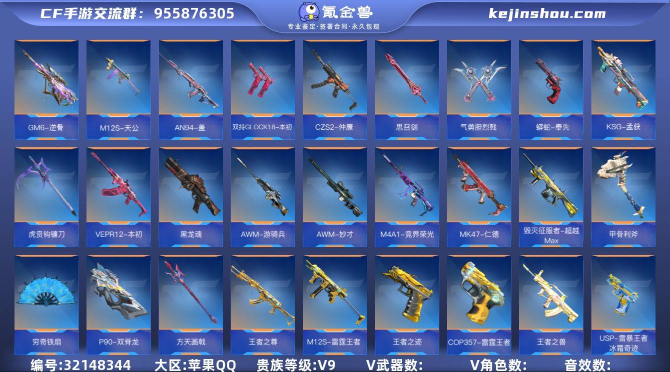 FC-VEVLTT 苹果QQ,成人号:是,角色等级:154,实名:有修改人脸机会/实名是本人,段位:专家S,VIP等级:V8,V武器数量:301,V角色数量:10,V总数量:215,王者武器数:21,万化数量:499, 【人物角色】孙悟空,关小雨,瞳,樱,大老师,复仇者,运动宝贝兰,零,幻影,潘多拉,斯沃特,夏日灵狐-X,龙妹,木兰,奥妹,蜀雪,月神,职场灵狐-赛事经理,斯薇特, 【王者武器】王者之竞烟雾弹,王者之竞闪光弹,唐刀-华夏传说,王者之心手雷,王者之心烟雾弹,王者之心闪光弹,王者之影闪光弹,王者之影烟雾弹,闪光弹-雷霆王者,烟雾弹-雷霆王者,王者之心,王者之影,王者之魄,王者之势,王者之怒,王者之魂,王者之锋,王者之烈,王者之迹,王者之城,王者幻神, 【至尊套装】怒至尊,心至尊,魄至尊, 【带V枪械】王者之锋-HeartShot,47-云舞-千变,AWM-天龙-魔神,王者幻神-冰霜奇迹,王者之心闪光弹-HeartShot,王者之心烟雾弹-HeartShot,M4A1-冰锋觉醒,M4A1-雷霆,沙鹰-火麒麟-钰,M4A1-变色龙,M4A1-Rush-夜袭,沙鹰-修罗-孤狼,M4A1-星象,M4A1-游骑兵,M4A1-死神,M4A1-黑骑士,M4A1-雷神,47-云舞,47-仁德,AK47-波塞冬,双持沙鹰-金银双煞-千变,AK47-血武士,消音毛瑟-常胜-铩魔,AK47-沙漠郡主-二觉,AK47-幸运日觉醒,AK47-孟德,AK47-奉先,COP 357-堕天神,M4A1-雷神-枪神之魄,AK47-无影-葵,AK47-Rush-星速,AK47-黑武士觉醒,M4A1-死神-能量核心,AK47-火麒麟,AK47-无影,81式-光明之神,81式-机械纪元,SKS-美杜莎,QBZ19-天使,M4A1-黑骑士-海王,QBZ03-金色蔷薇,M200-幻神,巴雷特-坦克堡垒,巴雷特-极光,TAC-慈,MR1-龙吟惊沧海,王者之影-燃竞之巅,AWM-裁决,AWM-天龙,09式狙-天神,加特林-蟒蛇,加特林-炼狱,加特林-堡垒,王者之魄-HeartShot,C