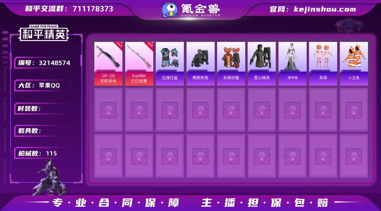 XS11410【深海小丑鱼 小丑鱼 身法号】苹果手Q-4特效枪-70套装-115枪皮-5王牌印记-超级王牌-28799热力值【4特效枪】DP-28-豹影疾电[5级],AKS-74U-森灵之息[5级],Mk14-福马献瑞[5级],Kar98K-巳巳如意[5级]【5稀有】深海小丑鱼,小丑鱼,AKM-缤纷海域,M762-奇异狩猎者,汤姆逊-奇异狩猎者【3飞行器】破刃行动尾迹,马上有福飞行器,登顶巅峰飞行器【1头盔】深海小丑鱼头盔【2背包】深海曼妙背包,深海小丑鱼背包【176其它衣服和枪皮】SS19特训,SS35特训,冰冻风暴,弄潮海豚,黑色伏地魔,SS34特训,酒红色名流,SS37特训,海岛探路者,SS20特训,马上来财,长空猛禽,顶瓜瓜,白色伏地魔,竞技名士,精神漫游,青翼流星,青涩时光,迅捷狂鲨,玉兔迎春,完美偶像,萌趣咩咩,SS10特训,SS31特训,麻辣教官,角色-海琴烟,幻世战舞者,薄荷星砂,SS13特训,SS36特训,甜蜜告白,朱霞炽焰,凌霄紫焰,牛气冲天,SS14特训,SS33特训,战地督导,SS9特训,SS30特训,黄色名流,角色-绛羽幽主,SS32特训,SS5特训,夏雨游龙,缤纷果语,特战装甲,元气之梦,玩偶服-菲菲,琴音绮想,福马献瑞,牛气满满,呆萌铁蟹,画境星梦,狙击之神,娴静芝兰,SS21特训,娇憨猪猪,SS12特训,鹰眼刺客,雪山精英,黄色伏地魔,疯狂小兔子,人气偶像,酷萌兔限定,战术大师,红釉青花,角色-军刀雅典娜,SS22特训,AWM-垂柳戏鸭,平底锅-属我最6,S686-红色方程式,MG-36-凌霄紫焰,JS9-凌霄紫焰,SLR-娇憨猪猪,AUG-异域银装,P92-凌霄紫焰,QBZ-神秘黑猫,AC-VAL-荒原烈焰,破片手榴弹-拽到爆炸,AC-VAL-天降萌叽,SPAS-12-狂鲨锋刃,燃烧瓶-福马献瑞,M1加兰德-画境星梦,P90-紫矿核心,撬棍-冰晶雪宝,M416-红色方程式,破片手榴弹-海盐豹豹,UMP45-蓝色火焰,Kar98K-彩虹符号,Vector-彩虹符号,SCAR-L-玉兔迎春,M416-蓝色火焰,M16A4