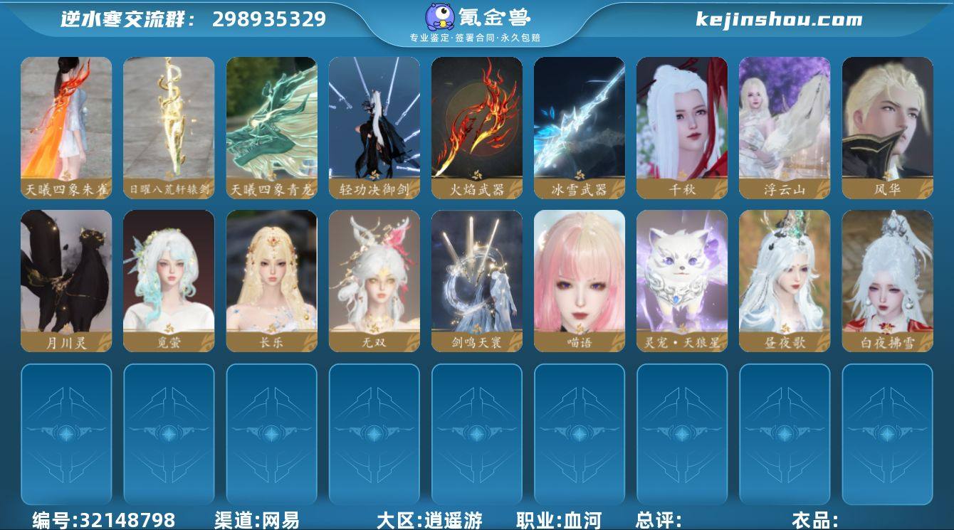 【区服】 扶摇万里 【战力值】 52.3 【职业】 血河 【馆藏】 6级 【衣品值】 247915 【国色值】 63640 【已用天赏石】 25 【天霓染数量】 2 【充值称号】 把酒临风 【累计充值】 31087元 【天霓染】 暗影沉渊*1, 陆离*1 【灵韵内功】 销干戈, 点明炉, 破釜 【稀有道具】 浑天劫 【副本外观】 白夜拂雪*1 【天赏外观】 觅萤, 长乐, 无双, 喵语, 昼夜歌, 风华, 浮云山, 千秋, 火焰武器, 雷霆武器, 冰雪武器, 水武器, 轻功诀御剑, 剑鸣天寰, 天曦四象·青龙, 天曦四象·朱雀, 日曜八荒·轩辕剑 【天赏祥瑞】 月川灵 【祥瑞坐骑】 骋风叱焰, 云螭·金玉纳福, 云螭·封冰怀雪, 呆宝, 云螭·烹鲜炊黍, 布丁, 龙衔瑞焰, 风行·江湖景, 丹锦喜狮, 风行·世间情, 金冠鼠鼠, 风行·万灯明, 纵风甲车·赤, 粉黛娇, 幻琉晶, 狂霸天, 沉木行马, 星河转·银昼, 星河转·金夕, 星河转·赤夜, 抟乌镇妖, 贺岁喜狮, 伯力, 咩郎, 瓜皮, 轩辕, 墨流云·玄色, 墨流云·靛青, 奔虹赤, 彩虹小马, 木小马, 赤兔, 隐云涧, 西部驴仔, 银砂素波, 四方游士, 侠道游, 犬威哮月·沧, 逍遥游, 玉霄飞练, 空山闲, 花花团子, 竹青团子, 梅香团子, 绒绒夜, 牛奶酥 【商城外观】 天离渊青, 司玄镇天, 金粉绮梦, 鸿福昭运, 雾蓝星瞳, 诗剑纵歌, 千星咏叹, 跃动心芒, 朔雪从风, 琼林萧瑟, 蝎影度月, 灼金喵影, 云腾游雾, 福禄金刚, 灵语星彩, 狼原灰骑, 晴蓝逸思, 暮夜陷落, 凤亭骁野, 悬蛛结心, 晴岸涛吟, 云汉逢夕, 不负卿愿, 玄喵夜行, 鳞纱幻海, 斗战凌空, 鳞骨逢幽, 乌夜禁巡, 星宫遐音, 贪狼摄星, 青林雀舞, 开阳执戈, 紫微御宵, 蓬海沧歌, 衣香鬓影, 混天焚莲, 逆鳞浊日, 火鸾鸿衣, 瀚渊龙炎, 君临重渊, 曦照东晖, 金祷颂晖, 玉泽凌烟, 烽火浮生, 赤狐魅语, 圣月沉夜, 醉墨狂歌, 天纵恒尊, 林泽仙踪, 广寒遗客, 瀚雪冰封, 苍龙浮山, 鱼龙鳞潜, 白灵幻尘, 灵鹿苍...
