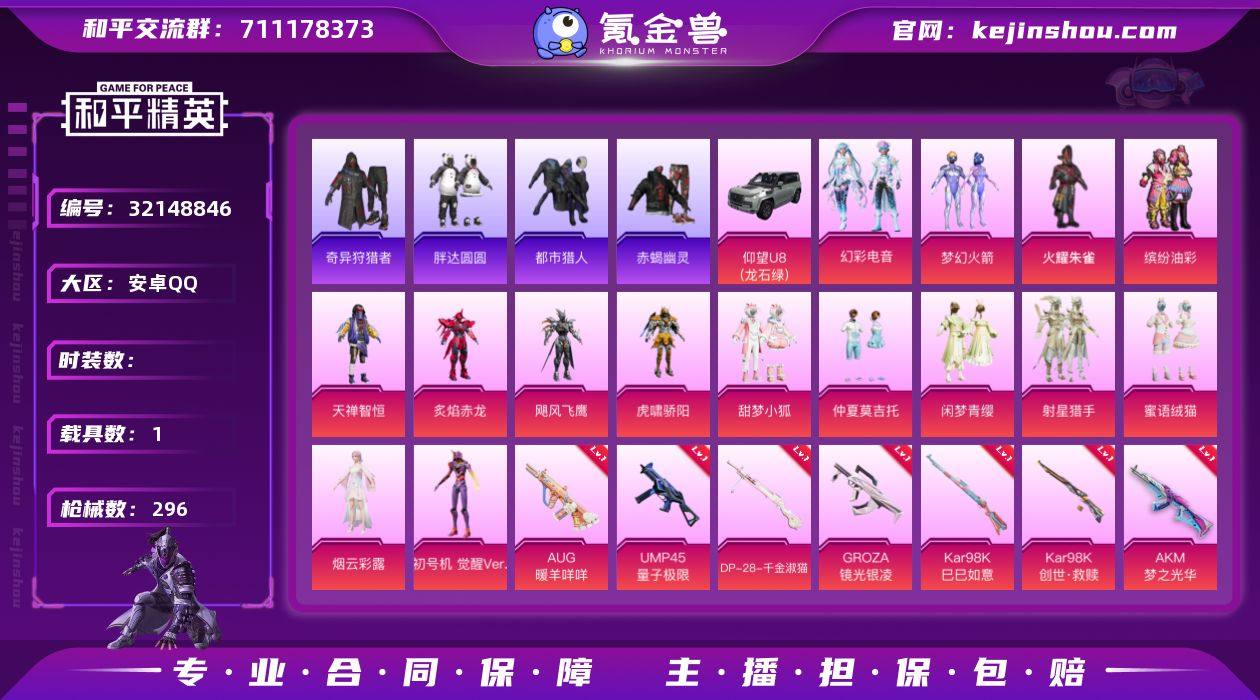 WJ816【网络公主号1载具-19粉装-12特效枪 缤纷油彩 复仇流浪者 梦幻火箭 初号机觉醒 赤蝎幽灵 胖达圆圆 都市猎人 蓝螳螂 奇异狩猎者 浪漫天命 7级梦之光华 】安卓手Q-1载具-19粉装-12特效枪-226套装-296枪皮-16王牌印记-坚韧铂金Ⅰ-99035热力值【1载具】仰望U8(龙石绿)【19粉装】射星猎手,闲梦青缨,创世·救赎,仲夏莫吉托,虎啸骄阳,角色-阿尔茜,飓风飞鹰,天禅智恒,角色-烟云彩露,角色-复仇流浪者,火曜朱雀,蜜语绒猫,角色-初号机 觉醒Ver.,甜梦小狐,角色-千金淑猫,缤纷油彩,炙焰赤龙,幻彩电音,梦幻火箭【12特效枪】DP-28-千金淑猫[3级],DP-28-豹影疾电[5级],Kar98K-巳巳如意[5级],Kar98K-创世·救赎[5级],AKS-74U-星穹咏叹调[6级],AKM-梦之光华[7级],GROZA-镜光银凌[5级],Vector-环太平洋[7级],UMP45-量子极限[5级],DP-28-暗夜鎏金[7级],PKM-江南烟雨[6级],AUG-暖羊咩咩[5级]【7稀有】奇异狩猎者,浪漫天命,赤蝎幽灵,都市猎人,胖达圆圆,S686-奇异狩猎者,M762-奇异狩猎者【9飞行器】深渊漩涡飞行器,顶峰精英尾迹,甜梦小狐飞行器,招财竹蜻蜓飞行器,破刃行动尾迹,幽焰列车飞行器,异域银装飞行器,空岛之星尾迹,光之冒险尾迹【484其它衣服和枪皮】黄色运动,白熊同盟,冰冻风暴,懵萌河马,...