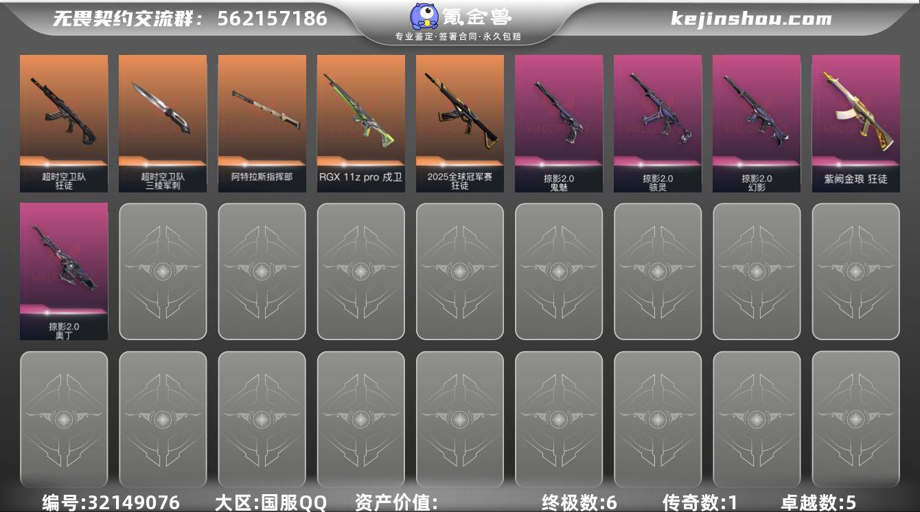 【2.1w库存掠夺2.0套装.三棱军刺.电工钳.25冠军.超时空.紫金】YXy5779【无二次】【因赛季更新游戏段付以上号为准!】 【套装】:掠影//2.0套装 【英雄】:幻棱,炼狱,暮蝶,壹决,铁臂,捷风,不死鸟,贤者,猎枭,芮娜,奇乐,尚勃勒,霓虹,斯凯,K/O,黑梦 【近战武器】:近战武器-魔术火花,近战武器-影钩,近战武器-超时空卫队 三棱军刺,近战武器-阿特拉斯指挥部 甩棍,近战武器-魔术火花 【狂徒】:狂徒-2025全球冠军赛,狂徒-超时空卫队,狂徒-紫阙金琅 【幻影】:幻影-掠影//2.0 【戍卫】:戍卫-RGX 11z Pro 【奥丁】:奥丁-掠影//2.0 【骇灵】:骇灵-掠影//2.0 【鬼魅】:鬼魅-掠影//2.0 【卡面】:热舞环节 卡面,树懒大作战 卡面,Clutch 卡面,梦幻奶茶 卡面,清除名单 卡面,无畏契约GO!第一卷:零 卡面,暗枪 卡面,铁臂设计图 卡面,代号红色 卡面,冰淇淋店 卡面,新兵报到 卡面,友军火力 卡面,V契约 卡面,无畏契约 卡面 【喷漆】:超级粉丝 喷漆,捷风差距 喷漆,霓光四射 喷漆,双击点赞 喷漆,买装还是存钱 喷漆,关门放狗 喷漆,蕊形灯 喷漆,胜利属于无畏契约 喷漆,GLHF 喷漆,无畏契约 喷漆 【挂饰】:V25第六幕:超凡 挂饰,袖珍捷风 挂饰,第九...