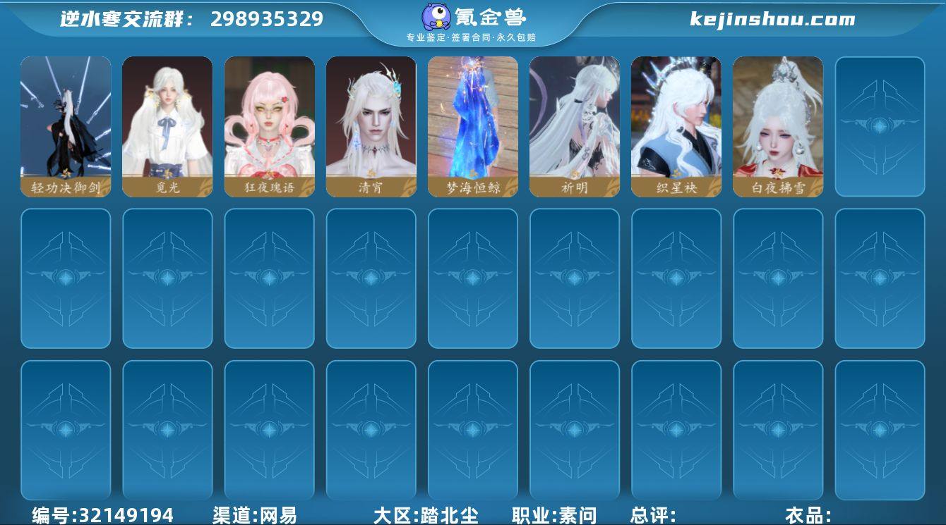 【区服】 帝都风云 【战力值】 110.53 【职业】 素问 【馆藏】 4级 【衣品值】 172020 【国色值】 45700 【已用天赏石】 10 【天霓染数量】 1 【充值称号】 把酒临风 【累计充值】 1438元 【天霓染】 觅光*1 【灵韵内功】 撼金阙 【副本外观】 白夜拂雪*1 【天赏外观】 觅光, 狂夜瑰语, 清宵, 织星袂, 祈明, 蝴蝶武器, 轻功诀御剑, 明河曙天·卧醉西海 【祥瑞坐骑】 布丁, 星河转·银昼, 风行·江湖景, 抟乌镇妖, 风行·世间情, 轩辕, 墨流云·玄色, 奔虹赤, 风行·万灯明, 呆宝, 云螭·金玉纳福, 云螭·庆舞迎春, 云螭·探宇寻寰, 龙衔瑞焰, 丹锦喜狮, 风行·谦谦有礼, 甜点鼠鼠, 金冠鼠鼠, 纵风甲车·赤, 粉黛娇, 幻琉晶, 沉木行马, 伯力, 咩郎, 瓜皮, 霸霸, 彩虹小马, 木小马, 赤兔, 花花团子, 腾云逐日, 梅香团子, 绒绒夜, 牛奶酥, 隐云涧, 四方游士, 踏歌行夜, 侠道游, 聆音及昼, 逍遥游, 犬威哮月·沧, 空山闲, 玉霄飞练 【商城外观】 幻梦巡礼, 温语愈心, 雾都往事, 贪狼摄星, 雾蓝星瞳, 苍蓝微风, 甜梦晴海, 破曙征潮, 雪团云绒, 音律织光, 海月漫歌, 修月碧海, 绯夜誓语, 鸿福昭运, 朝歌旧梦, 天籁闻歌, 晶梦绮舞, 灵珠饮月, 跃动心芒, 朔雪从风, 灼金喵影, 云腾游雾, 幽蝶眠花, 灵语星彩, 绯月狼舞, 绒粉美梦, 凤亭疏香, 悬蛛结心, 川峦游墨, 芳汀花影, 云汉逢夕, 难负君思, 帝皇铠甲, 白露惑心, 玄喵夜行, 鳞纱幻海, 鳞骨逢幽, 白尘游昼, 衣香鬓影, 金祷昼梦, 赤狐魅语, 圣月澄空, 天纵红颜, 苍龙云岫, 鱼龙灵泽, 白灵雪魅, 青玉引, 清风晓月, 春江初晴, 白羽武器 【配饰】 烟波渺, 夜阑玄翼 【武器环身】 赤焰流光, 剑渡东海