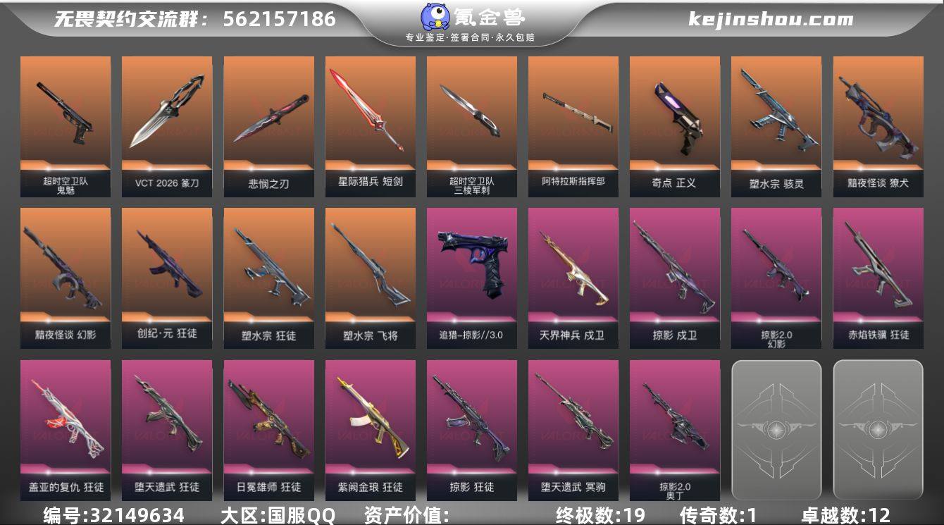 【LX18286】【14英雄70皮肤】【19传奇武器1终极12卓越】 【套装】:VCT 2026 赛季套装,无畏契约季前邀请赛套装,回火礼包// V25套装,回火礼包:掠影套装,掠影//3.0套装 【英雄】:炼狱,暮蝶,壹决,铁臂,捷风,幽影,不死鸟,贤者,猎枭,零,芮娜,霓虹,夜露,K/O 【近战武器】:近战武器-VCT 2026 篆刀,近战武器-影蝶,近战武器-无畏契约季前邀请赛 悲悯之刃,近战武器-流风回雪,近战武器-超时空卫队 三棱军刺,近战武器-神之刃,近战武器-紫金爪刀,近战武器-镭切,近战武器-阿特拉斯指挥部 甩棍,近战武器-星际猎兵 短剑 【狂徒】:狂徒-塑水宗,狂徒-创·纪元,狂徒-堕天遗武,狂徒-掠影,狂徒-盖亚的复仇,狂徒-日冕雄师,狂徒-紫阙金琅,狂徒-赤焰铁骥 【幻影】:幻影-黯夜怪谈,幻影-掠影//2.0 【戍卫】:戍卫-掠影,戍卫-天界神兵 【獠犬】:獠犬-黯夜怪谈 【冥驹】:冥驹-堕天遗武 【飞将】:飞将-塑水宗 【奥丁】:奥丁-掠影//2.0 【骇灵】:骇灵-塑水宗,骇灵-无限竞技 【追猎】:追猎-掠影//3.0 【正义】:正义-奇点 【鬼魅】:鬼魅-超时空卫队 【卡面】:孵化小能手:破壳鸭 卡面,从黄昏到黎明 卡面,唱片的故事 卡面,热舞环节 卡面,声感陷阱设计图 卡面,Clutch 卡面,梦幻奶茶 卡面,源能反应 卡面,零点嗅探设计图 卡面,无畏契约GO!第一卷:芮娜 卡面,清除名单 卡面,无畏契约GO!第一卷:零 卡面,龍记 卡面,《双城之战》金克丝 卡面,战术小伙伴 卡面,暗枪 卡面,代号红色 卡面,新兵报到 卡面,V契约 卡面,无畏契约 卡面 【喷漆】:孵化小能手:破壳鸭 喷漆,小小心意 喷漆,捷风差距 喷漆,审判之爪 喷漆,拼一枪 喷漆,我的刀呢? 喷漆,霓光四射 喷漆,新潮流 喷漆,双击点赞 喷漆,买装还是存钱 喷漆,醒狮贺春 喷漆,无畏契约GO!第一卷:零 喷漆,无...