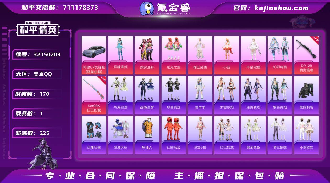 "h10381[妹妹号]7粉 6特 1载具 缤纷油彩 幻彩电音 千金淑猫 红熊茄茄 五把5级枪 仰望U7" 安卓 手Q-7粉装-6特效枪-1载具-3粉色飞行器-68981热力值-11王牌印记-170套装-225枪皮 【热门品类】:粉装-缤纷油彩,套装-浪漫天命,套装-龟仙人,套装-红熊茄茄 【粉色套装】:粉装-缤纷油彩,粉装-炫光之旅,角色-烟云彩露,角色-小蓝,角色-千金淑猫,粉装-幻彩电音,角色-异瞳寒姬 【粉色枪皮等级】:ACE32-萌骑漫游(二级),UMP45-萌骑冒险(五级),AKS-74U-森灵之息(五级),Kar98K-巳巳如意(五级),Mk14-福马献瑞(五级),DP-28-豹影疾电(五级) 【粉色载具】:仰望U7(阿盖尔紫) 【粉色枪皮】:ACE32-萌骑漫游,UMP45-萌骑冒险,AKS-74U-森灵之息,Kar98K-巳巳如意,Mk14-福马献瑞,DP-28-豹影疾电 【粉色飞行器】:炫彩糖果飞行器,黄族统领飞行器,粉樱探戈飞行器 【粉色降落伞】:太空嘟嘟降落伞,甜蜜草莓降落伞,千面幻镜降落伞,炫光之旅降落伞,莲影清波降落伞,萌酷奶龙降落伞,蜜语绒猫降落伞,江南烟雨降落伞,樱桃泡泡降落伞,星穹咏叹调降落伞,奇迹舞步降落伞,炫彩糖果降落伞 【稀有套装】:套装-龟仙人,套装-绒宝小鹅,套装-巳巳如意,套装-炫彩糖果,套装-马上来财,套装-雏菊兔兔,套装-萝兰蝴蝶,套装-小熊娃娃,套装-糖糖葫芦,套装-青团波波,角色-俏兔智灵,套装-燕燕于飞,套装-鱼渊荷华,角色-糖霜甜心,角色-蜜桃派对,套装-粉恋花,套装-紫幽梦,套装-蓝冰羽,角色-猎影月神,套装-星渊小夜曲,套装-彩虹兔,套装-云朵鹅,套装-雪绒豹,角色-灵公主,角色-黯羽织刑,套装-蓝海鲸歌,套装-朱霞炽焰,套装-凌霄紫焰,套装-擎苍青焰,玩偶服-喜羊羊,套装-书海巡游,套装-画境星梦,套装-琴音绮想,角色-馥郁金蕊,套装-雨过天青,套装-红釉青花 【稀有枪皮】:AKM-2P战斗服款,AKM-彩虹符号,...