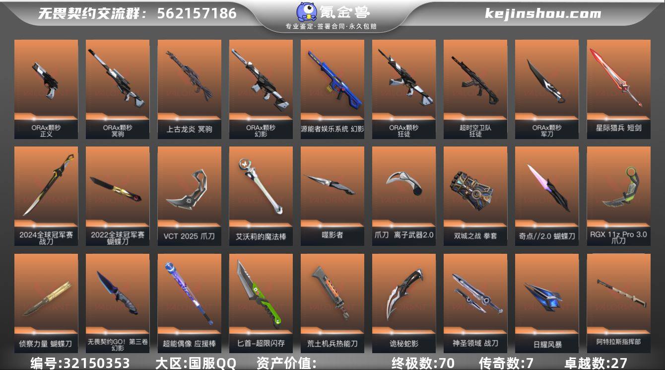 【Hww496】Q区 可二次 皮肤价值188570【70橙皮 7金皮 27紫皮 226皮肤 27英雄 201卡面 2445已用源晶】 超凡 优质装备:2024全球冠军赛套装,2022全球冠军赛套装,VCT 2025 赛季套装,奇点//2.0套装,回火礼包:奇点套装 【套装】:2024全球冠军赛套装,2022全球冠军赛套装,ORA x 颗秒套装,噬影者套装,VCT 2025 赛季套装,西部未来套装,RGX 11z Pro//3.0套装,《双城之战》收藏套装,奇点//2.0套装,回火礼包:奇点套装,掠影//2.0套装,离子武器//2.0套装,英雄之选套装 【英雄】:幻棱,炼狱,维斯,暮蝶,钛狐,壹决,铁臂,捷风,雷兹,幽影,不死鸟,贤者,猎枭,蝰蛇,零,芮娜,奇乐,尚勃勒,霓虹,斯凯,夜露,星礈,K/O,海神,盖可,黑梦,钢锁 【近战武器】:近战武器-2024全球冠军赛 战刀,近战武器-2022全球冠军赛 蝴蝶刀,近战武器-碎心裂刃,近战武器-ORA x 颗秒 军刀,近战武器-影钩,近战武器-无畏契约GO!第三卷 匕首,近战武器-穿花蝴蝶,近战武器-侦察力量 蝴蝶刀,近战武器-剥皮小刀,近战武器-奇点//2.0 蝴蝶刀,近战武器-VCT 2025 爪刀,近战武器-紫金爪刀,近战武器-RGX 11z Pro//3.0 爪刀,近战武器-黑波之刃,近战武器-落英飞旋,近战武器-噬影者 簇刃,近战武器-艾沃莉的魔法棒,近战武器-威龙之刃,近战武器-鬼丸国纲,近战武器-离子武器//2.0 爪刀,近战武器-双城之战 拳套,近战武器-未来开拓者,近战武器-超能偶像 应援棒,近战武器-超限闪存 匕首,近战武器-定海神珍,近战武器-荒土机兵 热能刀,近战武器-生物分子解离器,近战武器-天御刀,近战武器-夜刃诡镰,近战武器-影刃,近战武器-诡秘蛇影 军刀,近战武器-神圣领域 战刀,近战武器-日耀风暴 遗器,近战武器-阿特拉斯指挥部 甩棍,近战武器-星际猎兵 短剑 【狂徒】:狂徒-光明哨兵,狂徒-洪荒怒焰,狂徒-混沌序曲,狂...
