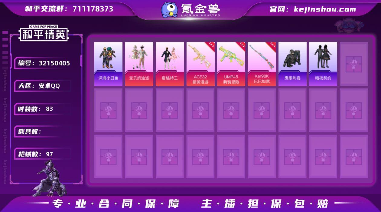 DYH18046【女号2粉装3特效 宝贝奶油派 小丑鱼】安卓手Q-2粉装-3特效枪-83套装-97枪皮-4王牌印记-坚韧铂金Ⅱ-27755热力值【2粉装】宝贝奶油派,蜜桃特工【3特效枪】ACE32-萌骑漫游[5级],Kar98K-巳巳如意[5级],UMP45-萌骑冒险[3级]【1稀有】小丑鱼【3飞行器】火焰蝠人飞行服,粉色滑翔尾迹,顶峰精英尾迹【3头盔】梦幻火箭头盔,童趣迷兔头盔,金羽特工头盔【2背包】夏日绵绵冰背包,金羽特工背包【174其它衣服和枪皮】元气发射,缤纷果语,微雨春柳,快乐星愿,幻世战舞者,锦衣飞扬,黄色伏地魔,柠萌假日,猛禽,绯格组合,星途旅人,街头潮人,SS30特训,白熊同盟,耀粉歌者,橘黑制服,鹰眼刺客,娇憨猪猪,纯真浪花,竞技达人朋克,人气偶像,SS25特训,角色-银尘,红色运动,黄色名流,特训学院,SS24特训,灵幻魔术师,猎梦纪元,SS32特训,玉兔迎春,湖蓝色名流,鹤鸣,SS21特训,SS31特训,酒红色名流,懵萌河马,战术大师,甜心亚梦,SS29特训,特殊使命,海盐绵绵冰,青年教官,神气柴柴,王牌教练,猎鹰,红釉青花,白色伏地魔,海岛探路者,虚音幻奏,冷焰舞者,热情海星,黑色伏地魔,魅力单车,冰川特警,龙的传人,元素星魂,蓝色运动,SS23特训,雨过天青,狙击之神,SS20特训,完美偶像,SS37特训,曼妙人鱼,萌趣咩咩,长空猛禽,深蓝色...