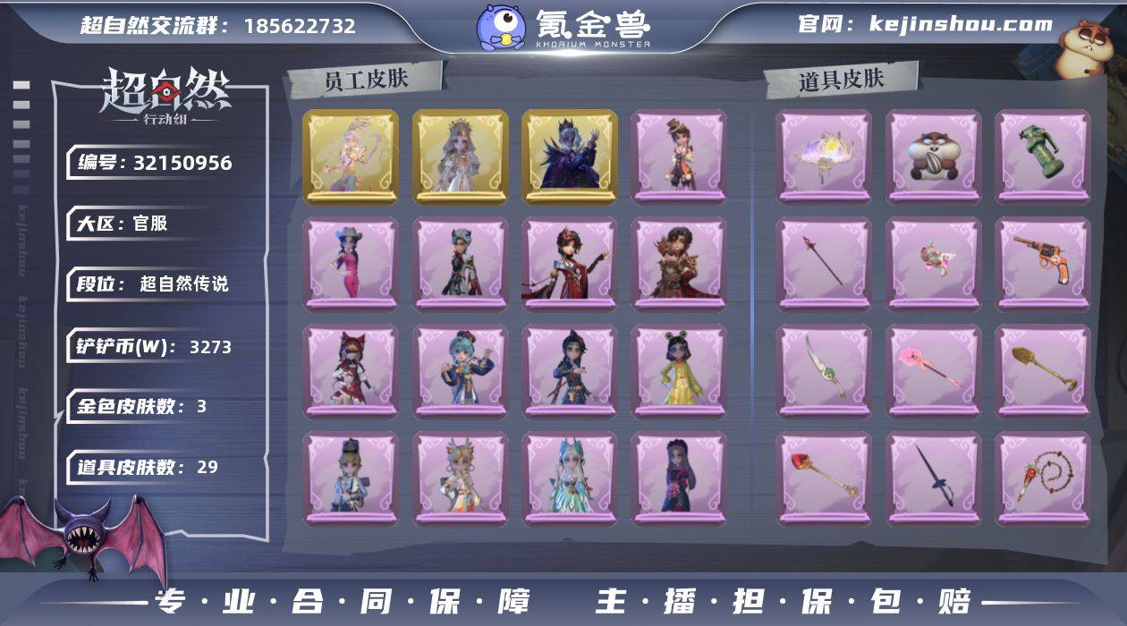 金皮3;紫皮20;道具皮29;皮肤:零-渡鸦公爵,薇薇安-圣光之谕,逍遥-莲华渡,莉莉-莓果陷阱,薇薇安-仙锋小姐,阿念-灵昭鹿鸣,小黄-呱呱雨衣,薇薇安-黑月挽歌,爱丽丝-丝缕哀歌,艾伦-水王子,艾伦-黎明猎手,莉莉-情公主,逍遥-泽引山海,巫铃儿-素影瑶光,阿念-迷途僵宝,零-搬开山,小黄-霓裳踏雪,阿念-王子与骑士,零-青云逸歌,逍遥-绣春逍影,爱丽丝-耀眼的你,阿念-庆宴绮愿,爱丽丝-瑞羽衔春;道具:铲子-圣心之泪,音响-月光奏鸣曲,急救包-蔷薇物语,长鞭-新春炸响,桃木剑-永眠曲,长鞭-缚誓之锁,铲子-赞萌波板糖,摸金符-紫霄,腰包-月下莲台,闪光弹-金戈玄铜,腰包-宝剑八,急救包-土拨鼠捏捏,摸金符-花落精绝,铲子-龙鳞,转轮手枪-新星时代,腰包-红运福虎,短管猎枪-赞萌露比水枪,黄牛能量饮料-珍珠芭乐莓莓,喷气背包-乘风溯雪,电击枪-甜蜜泡泡枪,音响-鸣沙鼓,夜视仪-金丝眼镜,折扇-赴此良宵,长枪-罪棘,专业手电-花束般的告白,长枪-波塞冬,短管猎枪-星光的裁决,长鞭-飞天绫,刺刀-碧络琅环;美妆:美妆-天使之泪,美妆-暗夜小恶魔;饰品:头饰-雪墩墩头套,头饰-饺饺者头套,头饰-小狗蛇点点头套,头饰-樱桃奶油布丁,头饰-鳄霸天头套,头饰-呆滞头套,头饰-哈士奇头套,头饰-蒜了八,头饰-大葱明头套,头饰-惊魂南瓜头套,头饰-萨卡班甲鱼头套,头饰-马上有钱,头饰-驼半仙头套,头饰-太空鲨头套,头饰-炙热烧烤,头饰-烈焰红唇头套,头饰-滑稽头套,头饰-鱼头怪头套,头饰-火爆了头套,头饰-面具马头套,头饰-烛光纪念,头饰-精致露比头套,头饰-小财神豚豚头套,头饰-嘻嘻头套,头饰-卑微头套,头饰-像素朋克墨镜,头饰-后室幸存者头套,挂饰-钗头凤,挂饰-晚安小熊,挂饰-尘封旧事,挂饰-九色祥鹿,挂饰-孤独对望,挂饰-未竟乐园,挂饰-天使消失的年代,挂饰-糖果守卫,背饰-侧耳倾听,背饰-醉花阴,背饰-白鼬趴趴,背饰-天使的呼唤,背饰-毛球夹子,背饰-牛啤背包,背饰...