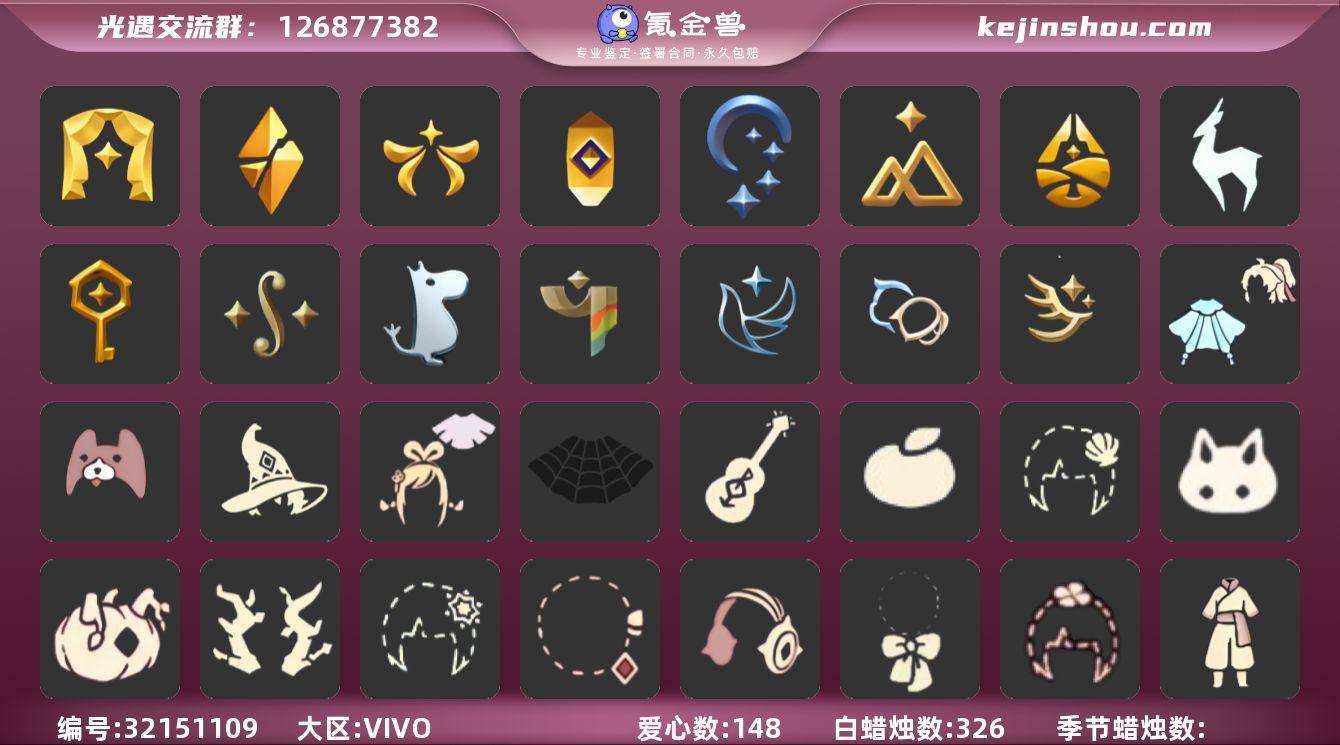 账号类型: 手机账号 季节已毕业: 表演季,破晓季,欧若拉季,夜行季,追忆季,拾光季,归巢季,九色鹿季,筑巢季,二重奏季,姆明季,彩染季,青鸟季,双星季,迁徙季 完成地图: 晨岛,云野,雨林,霞谷,暮土,禁阁 珍稀物品: 白枭,透明蝶翼斗,彩虹围巾 礼包: 巫师,绊爱,蜘蛛斗,吉他,橘子,贝壳,兔子,南瓜,枯角,雪花,彩虹耳钉,彩虹耳机,蝴蝶结,四叶草,暗彩装扮,日光耳环,小狗周年发饰,青衫落拓礼包 裤子: 武士裤,背带裤,搓澡巾,击剑裤,妮妮裙子,蓝绿裤,飞天裤,筑巢季·裤子,青鸟尊贵蓬头裤子 面具: 夜行毕业面具,黄眉企鹅面具,辉光羚羊面具 面饰: 红耳机,黑框眼镜,青鸟毕业面饰 项链: 围巾 发型: 归巢毕业发型,若笠,虚荣,留辫蘑菇头,飞天盘发 头饰: 牛仔帽,蓝色音乐会,平顶帽 斗篷: 海洋斗,绿芽,粉红绒毛斗篷,遥鲲斗篷,燕尾斗篷,冥龙斗篷,彩染围巾斗篷,青鸟毕业斗篷 配饰: 雨伞,筑巢季·小手办,高音钢琴,姆明抱枕,小红伞,相机,二重奏挂画,鲲灯 亮点: 【优质装备】:表演季,白枭(帝企鹅发),武士裤,破晓季,透明蝶翼斗,欧若拉季(欧若拉),归巢毕业发型(五塑彩羽发),筑巢季·小手办(光之子试衣),高音钢琴(白色高脚钢琴),夜行季,追忆季,妮妮裙子(妮妮长裙),牛仔帽(西部帽),姆明抱枕,小红伞(姆明红伞)(姆明大伞),相机(季卡相机),拾光季,彩虹围巾(五塑彩带斗),归巢季,九色鹿(九色鹿季),蓝绿裤(高领舞服),飞天裤(柔缎花边连)(九色鹿丝带裤),围巾(肩带),筑巢季,绊爱(绊爱斗篷)(绊爱礼包),红耳机,蜘蛛斗(蛛丝斗篷)(蛛网斗篷),吉他(音韵吉他)(白吉他),巫师(巫师帽),晨岛,云野,雨林,霞谷,墓土(暮土),禁阁,若笠(箬笠),青鸟尊贵蓬头裤子(蓝色燕尾服),二重奏季,二重奏挂画(合奏挂画),姆明季,筑巢季·裤子(设计师长袍),夜行毕业面具(棕熊面具),黄眉企鹅面具,黑框眼镜(粗框眼镜),留辫蘑菇头,粉红绒毛斗篷(绒毛斗篷),遥鲲斗篷(双翼遥鲲斗),燕尾斗篷,冥龙斗篷,...