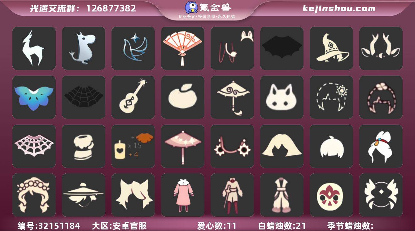 蜡烛数量:21 爱心数量:11 翼数量:0 九色鹿季,姆明季,青鸟季 青鸟毕业斗篷,奔月斗篷,黑边红绒斗篷 平菇发型,正太发型,飞天盘发,花环,若笠,猫耳 妮妮裙子,击剑裤,飞天裤 花纹面具 青鸟毕业面饰,红耳机 小红伞,姆明抱枕,雨伞,高音钢琴 平顶帽,金色音乐会,蓝色音乐会 献瑞折扇礼包,姆明饰品套装,蝙蝠套,巫师,九色鹿角,莲花斗,蜘蛛斗,吉他,橘子,红伞,兔子,雪花,四叶草,透明蛛丝,雪人鞋,创始人,飞鸟纸伞,日光耳环 卖家说:可以联系我谈价格