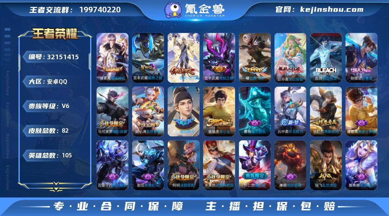 安卓Q-V6-最强王者段位-105英雄-82皮肤-1典藏皮肤-3传说-22史诗【荣耀典藏】:诸葛亮星域神启【传说皮肤】:司空震愿照山河定,曜云鹰飞将,宫本武藏地狱之眼【限定皮肤】:李白谪仙醉月,狄仁杰阴阳师,赵云皇家上将,阿轲迷踪丽影,马可波罗暗影游猎,狄仁杰魔术师,狄仁杰万华元夜,达摩星际陆战队,项羽海滩派对,老夫子醍醐杖,程咬金演武夺筹,刘邦夺宝奇兵,孙悟空至尊宝,钟馗驱傩正仪,鬼谷子原初探秘者,弈星混沌棋,明世隐疑决卦,裴擒虎李小龙,米莱狄胡桃异想国,云中君纤云弄巧,猪八戒西部大镖客,桑启海盐诗旅,姬小满妄想食味【年限皮肤】:司空震愿照山河定【赛季限定】:弈星混沌棋,明世隐疑决卦,老夫子醍醐杖,鬼谷子原初探秘者,狄仁杰万华元夜,程咬金演武夺筹,钟馗驱傩正仪,桑启海盐诗旅,亚瑟荣光之誓【战令限定】:阿轲迷踪丽影,刘邦夺宝奇兵,马可波罗暗影游猎,猪八戒西部大镖客,米莱狄胡桃异想国,达摩星际陆战队【史诗皮肤】:公孙离涂山容容,后羿石田雨龙,李白谪仙醉月,姬小满妄想食味,沈梦溪月团寄思,米莱狄胡桃异想国,云中君纤云弄巧,裴擒虎李小龙,马可波罗暗影游猎,阿轲迷踪丽影,狄仁杰鹰眼统帅,百里守约特工魅影,雅典娜...