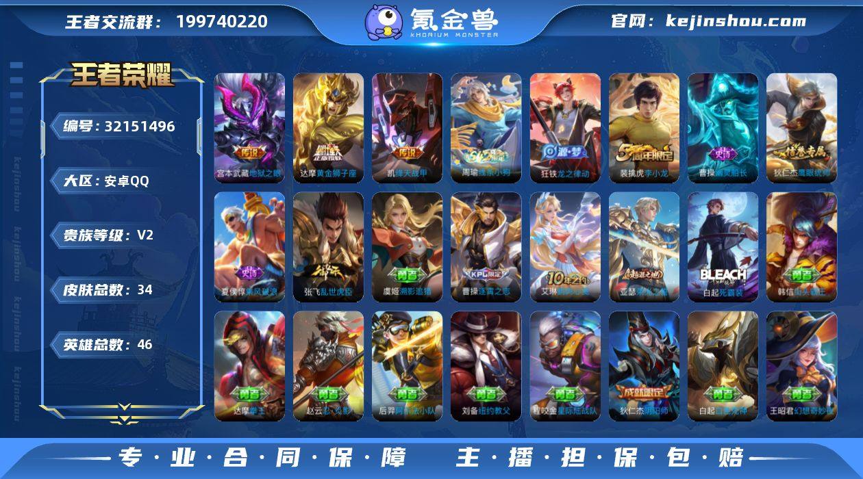安卓Q-V2-最强王者段位-46英雄-34皮肤-3传说-6史诗【传说皮肤】:铠绛天战甲,达摩黄金狮子座,宫本武藏地狱之眼【限定皮肤】:狄仁杰阴阳师,裴擒虎李小龙【赛季限定】:亚瑟荣光之誓【战令限定】:周瑜线条小狗【史诗皮肤】:周瑜线条小狗,狂铁龙之律动,裴擒虎李小龙,狄仁杰鹰眼统帅,夏侯惇乘风破浪,张飞乱世虎臣,曹操幽灵船长【其他皮肤】:虞姬溯影追猎,曹操逐霄之志,艾琳鹤鸣心笺,亚瑟荣光之誓,白起死霸装,狂铁命运角斗场,王昭君幻想奇妙夜,刘备纽约教父,狄仁杰阴阳师,后羿阿尔法小队,达摩拳王,典韦黄金武士,白起白色死神,程咬金星际陆战队,赵云忍炎影,韩信街头霸王,韩信教廷特使,澜孤猎,盘古创世神祝,元歌午夜歌剧院,明世隐占星师,铠龙域领主,杨戬埃及法老,孙悟空西部大镖客【营地ID】:1738259708
