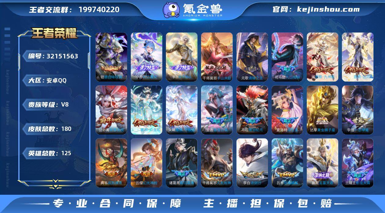安卓Q-V8-最强王者段位-125英雄-180皮肤-1典藏皮肤-2无双-25传说-64史诗【英雄全皮】:司马懿全皮,少司缘全皮【荣耀典藏】:铠银白咏叹调【无双皮肤】:小乔时之魔女,李白碎月剑心【传说皮肤】:干将莫邪千山共赴,元歌诡秘之主,司马懿九山相柳,司空震愿照山河定,女娲愿照千秋盛,妲己愿照众生和,澜愿照九州拓,云缨幻光神枪,嬴政玄雷天君,亚连落雪白狼,典韦战鼓燎原,马超琥珀纪元,兰陵王影龙天霄,诸葛亮鹤羽星尊,夏洛特浮生妄,吕布怒海麟威,李白诗剑行,公孙离祈雪灵祝,虞姬启明星使,李信一念神魔,貂蝉猫影幻舞,张良黄金白羊座,干将莫邪久胜战神,虞姬云霓雀翎,达摩黄金狮子座【限定皮肤】:暃埋骨钱,狄仁杰阴阳师,赵云皇家上将,墨子神迹守卫,墨子降魔,元歌无心,马可波罗暗影游猎,马可波罗山海玄木吟,狄仁杰魔术师,项羽海滩派对,韩信傲雪梅枪,兰陵王影龙天霄,刘备百相守梦,虞姬启明星使,干将莫邪冰霜恋舞曲,诸葛亮鹤羽星尊,百里玄策原初追逐者,公孙离祈雪灵祝,裴擒虎李小龙,夏洛特浮生妄,阿古朵江河有灵,张良古海寻踪,高渐离燃音魔法,妲己灵卜魔法,鬼谷子天穹祈灯,李白碎月剑心,伽罗琥珀纪元,马超琥珀纪元,姬小满妄想食味,小乔时之魔女,安琪拉乘龙聚宝船,亚连落雪白狼,刘邦剑破天穹【年限皮肤】:公孙离祈雪灵祝,马可波罗山海玄木吟,安琪拉乘龙聚宝船,司空震愿照山河定,女娲愿照千秋盛,妲己愿照众生和,澜愿照九州拓【赛季限定】:张良古海寻踪,鬼谷子天穹祈灯,刘邦剑破天穹,太乙真人谧流熔炉,钟馗虚灵犬护,甄姬逆浪荇歌,亚瑟荣光之誓,百里玄策原初追逐者,项羽九幽镇关【战令限定】:马可波罗暗影游猎,墨子神迹守卫,高渐离燃音魔法,妲己灵卜魔法,孙膑茶境仙,马超访茗客,刘禅鸭鸭历险记,沈梦溪鸭鸭历险记,周瑜百相守梦,孙策百相守梦...