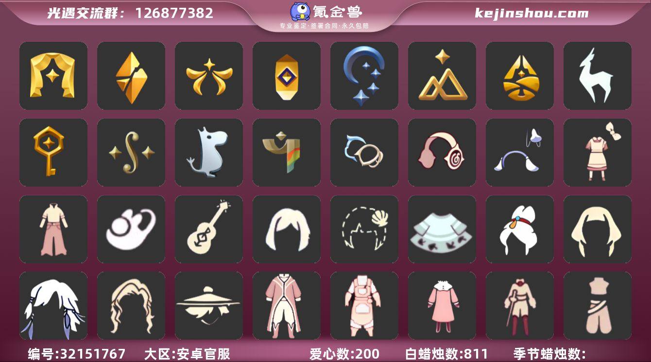 账号类型: 手机账号 季节已毕业: 表演季,破晓季,欧若拉季,夜行季,追忆季,拾光季,归巢季,九色鹿季,筑巢季,二重奏季,姆明季,彩染季,双星季 珍稀物品: 白枭,透明蝶翼斗,彩虹围巾 礼包: 牛仔裤,兔子鞋,吉他,奔跑发型,贝壳,遥鲲披肩斗篷,爱丽丝围裙套装礼包,活力海牛礼包,云音伴游耳机 裤子: 击剑裤,妮妮裙子,蓝绿裤,飞天裤,筑巢季·裤子,青鸟尊贵蓬头裤子 面具: 夜行毕业面具,黄眉企鹅面具,辉光羚羊面具 面饰: 黑框眼镜,青鸟毕业面饰 项链: 围巾 发型: 归巢毕业发型,若笠,虚荣,留辫蘑菇头,飞天盘发 头饰: 牛仔帽,蓝色音乐会,平顶帽 斗篷: 海洋斗,绿芽,粉红绒毛斗篷,遥鲲斗篷,燕尾斗篷,冥龙斗篷,彩染围巾斗篷 配饰: 筑巢季·小手办,高音钢琴,姆明抱枕,小红伞,相机,二重奏挂画,鲲灯 亮点: 【优质装备】:表演季,白枭(帝企鹅发),青鸟尊贵蓬头裤子(蓝色燕尾服),破晓季,透明蝶翼斗,欧若拉季(欧若拉),归巢毕业发型(五塑彩羽发),若笠(箬笠),筑巢季·小手办(光之子试衣),高音钢琴(白色高脚钢琴),夜行季,追忆季,妮妮裙子(妮妮长裙),牛仔帽(西部帽),姆明抱枕,小红伞(姆明红伞)(姆明大伞),相机(季卡相机),拾光季,彩虹围巾(五塑彩带斗),归巢季,九色鹿(九色鹿季),蓝绿裤(高领舞服),飞天裤(柔缎花边连)(九色鹿丝带裤),围巾(肩带),筑巢季,二重奏季,二重奏挂画(合奏挂画),姆明季,筑巢季·裤子(设计师长袍),夜行毕业面具(棕熊面具),黄眉企鹅面具,黑框眼镜(粗框眼镜),留辫蘑菇头,粉红绒毛斗篷(绒毛斗篷),遥鲲斗篷(双翼遥鲲斗),燕尾斗篷,冥龙斗篷,鲲灯(追忆之书),辉光羚羊面具,彩染季,飞天盘发(九色鹿丸子头),青鸟毕业面饰(青鸟面饰),双星季,吉他(音韵吉他)(白吉他),遥鲲披肩斗篷(披肩外袍),爱丽丝围裙套装礼包,牛仔裤(阔腿牛仔),活力海牛礼包,兔子鞋(兔子拖鞋),奔跑发型(奔离远行发),贝壳(贝壳发饰)