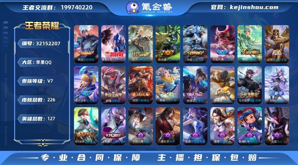实名: 可修改 性别: 男号 贵族等级: V7 英雄数: 127 皮肤数: 226 荣耀水晶: 弑枪猎影 珍品传说: 江户川柯南 传说皮: 黄金射手座,末日机甲-孙尚香,无双飞将,妄想实况,神树通天 限定皮: 游园惊梦,梁祝,天狼绘梦者,至尊宝,高山流水,孙行者,五谷丰年,绯月行,神器·万象笔,山海·玄木吟,鸣野蒿 亮点: 【优质装备】:弑枪猎影(韩信典藏),江户川柯南,黄金射手座,末日机甲-孙尚香(绿蚂蚱),无双飞将,妄想实况
