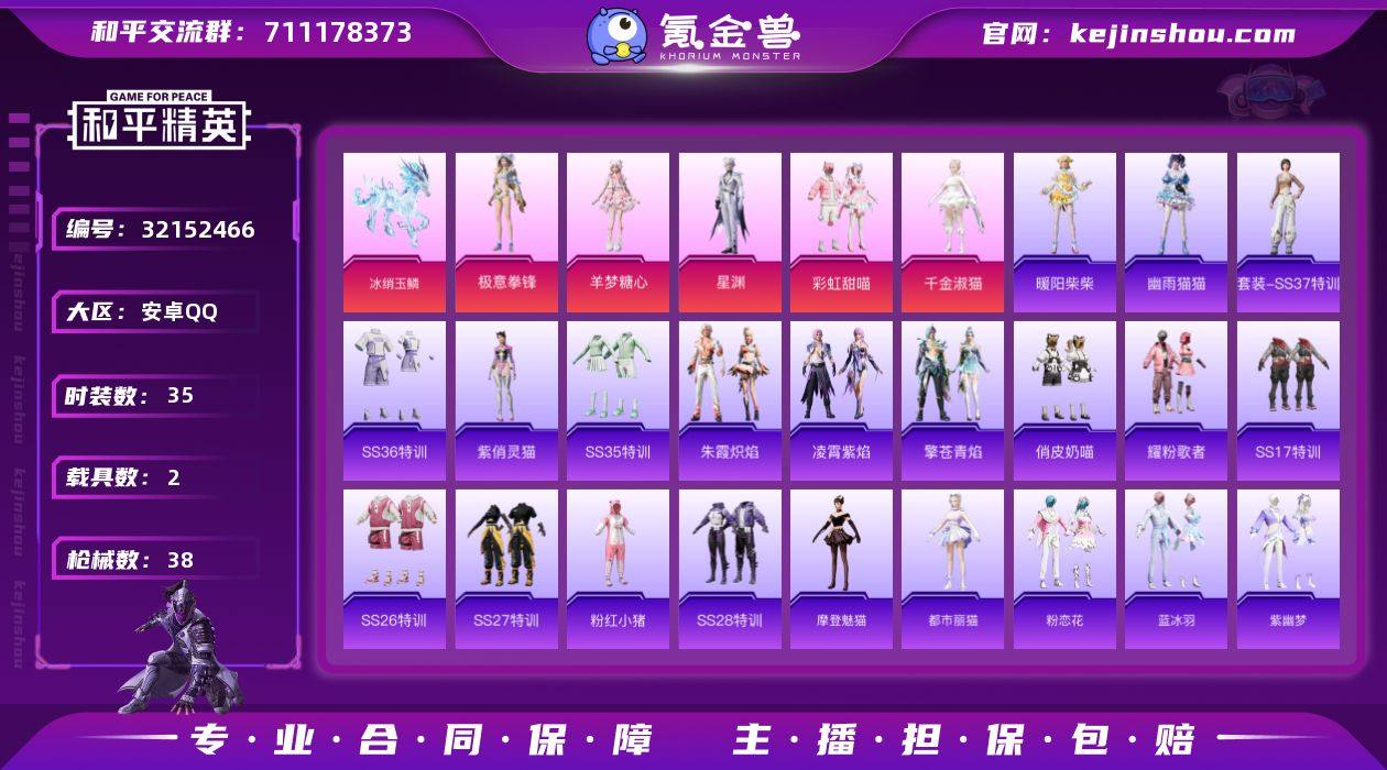 【和平精英】5粉装,4特效枪,4载具,历史最高段位:卓越王牌10星 王牌印记8次 热力值:41171,72套装,109枪械,180装备,88战备;套装:套装-彩虹甜喵,角色-千金淑猫,角色-羊梦糖心,角色-星渊,套装-极意拳锋,套装-竞技名士,套装-黄色名流,套装-海岛探路者,套装-冷焰舞者,套装-完美偶像,套装-缤纷果语,套装-滨海厨神,套装-粉红小猪,套装-破蛋小黄鸡,套装-疯狂小兔子,套装-鹤鸣,套装-白糯汤圆,套装-狙击之神,套装-耀粉歌者,套装-SS17特训,套装-福星高照,套装-虎虎生威吉莉,套装-空投萌叽,套装-炫蓝之夏,套装-俏皮奶喵,套装-王牌教练,套装-SS25特训,套装-龙的传人,套装-SS26特训,套装-空岛之星,套装-SS27特训,套装-老实芭蕉,套装-SS28特训,套装-海盐绵绵冰,角色-紫俏灵猫,角色-无面战甲,套装-异域银装,角色-摩登魅猫,角色-蜜桃派对,角色-都市丽猫,套装-SS31特训,套装-紫幽梦,套装-粉恋花,套装-SS33特训,套装-云朵鹅,套装-SS32特训,套装-彩虹兔,套装-青翼流星,套装-蓝冰羽,套装-顶瓜瓜,套装-雪绒豹,套装-狂鲨锋刃,套装-大橘大利,套装-星渊小夜曲,套装-炫彩糖果,玩偶服-喜羊羊,玩偶服-美羊羊,套装-元气之梦,套装-SS34特训,套装-擎苍青焰,套装-朱霞炽焰,套装-凌霄紫焰,套装-薄荷星砂,套装-SS35特训,套装-SS37特训,套装-SS36特训,套装-雪国风尚,套装-超能元气,套装-萌鸡速递,角色-幽雨猫猫,套装-福马献瑞,角色-暖阳柴柴;枪皮:AUG-天降萌叽,AUG-异域银装,AUG-绝对恒星,AUG-冰晶雪宝,M16A4-千金淑猫,蜜獾-天降萌叽,蜜獾-精灵梦叶罗丽,蜜獾-冰澜龙吟,蜜獾-启元战纹,蜜獾-乌木金纹,3级AKM-暮色玫影,AKM-涂鸦街区,AKM-彩虹符号,AKM-龙的传人,AKM-霓彩脉冲,GROZA-海盐豹豹,GROZA-无面战甲,GROZA-暮色玫影,GROZA-福马献瑞,SCAR-L-...