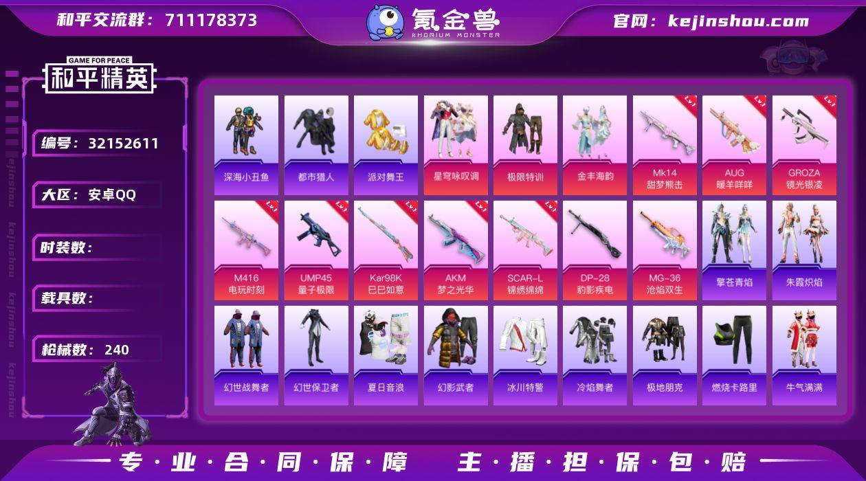 训 满地铁天赋】c27049-【可二次】【因赛季更新游戏段付以上号为准!】 安卓Q-3稀有3粉装15特效枪8热门152套装240枪皮 7w热力值 15印记 历史传奇王牌15星 【3稀有】 都市猎人 派对舞王 派对舞王(金靴子) 【3粉装】 金丰海韵 星穹咏叹调 极限特训 【15特效枪】 SCAR-L-锦绣绵绵 (5级) M416-电玩时刻 (5级) AKS-74U-森灵之息 (4级) Kar98K-巳巳如意 (5级) MG-36-沧焰双生 (5级) DP-28-豹影疾电 (5级) AUG-暖羊咩咩 (5级) UMP45-量子极限 (5级) Mk14-甜梦熊击 (5级) GROZA-镜光银凌 (5级) AKM-梦之光华 (7级) 信号枪-金乌曜日 (2级) AKS-74U-森灵之息 (4级) Mk14-福马献瑞 (5级) ACE32-萌骑漫游 (3级) 【8热门】 龟仙人 晶辉守护 深海小丑鱼 粉红小猪 漫步者 粉甜马卡龙 破蛋小黄鸡 M762-奇异狩猎者 【2飞行器】 镜光幻境飞行翼 萌物绒绒飞行器 【1头盔】 百万伏特头盔 【1背包】 百万伏特背包