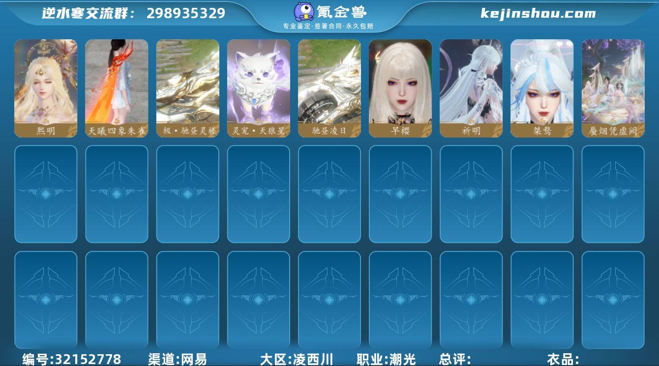 【区服】 天府之国 【战力值】 97.03 【职业】 沧澜 【馆藏】 6级 【衣品值】 156725 【国色值】 52760 【已用天赏石】 22 【天霓染数量】 3 【充值称号】 把酒临风 【累计充值】 43540元 【天霓染】 凤吟振羽*1, 野月*1, 双蕊*1 【灵韵内功】 万化冥合 【天赏外观】 桀骜, 早樱, 祈明, 熙明, 水武器, 天曦四象·朱雀 【天赏祥瑞】 驰昼凌日, 极·驰昼灵槎, 蜃烟凭虚阙 【祥瑞坐骑】 星河转·赤夜, 呆宝, 骋风叱焰, 布丁, 风行·江湖景, 云螭·庆舞迎春, 粉黛娇, 幻琉晶, 狂霸天, 伯力, 咩郎, 墨流云·玄色, 墨流云·朱红, 墨流云·靛青, 奔虹赤, 彩虹小马, 银砂素波, 独步悠然车, 玉霄飞练, 绒绒夜, 牛奶酥, 隐云涧 【商城外观】 绒粉美梦, 苍蓝微风, 难负君思, 星蝶离火, 帝皇铠甲, 玄喵夜行, 鳞纱幻海, 白尘游昼, 贪狼摄星, 青林雀舞, 开阳执戈, 兰亭觞咏, 衣香鬓影, 混天焚莲, 曦照东晖, 金祷昼梦, 金粉绮梦, 烽火浮生, 白灵雪魅, 鸢蔷画袖 【配饰】 夜阑玄翼 【武器环身】 危命旋舞, 玉壶乾坤, 照罪赦渊, 渊墟深影 【天赏灵宠】 灵宠·天狼星